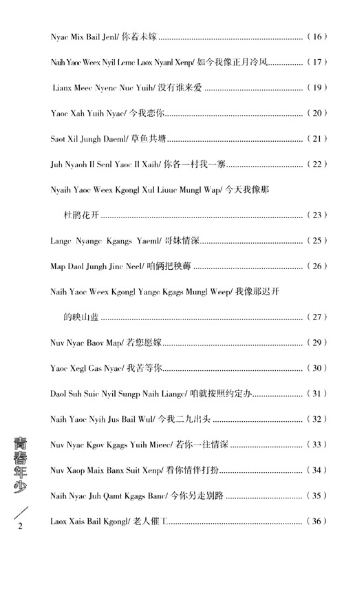 书收录了传唱于侗族南部地区的经典口传歌谣,为情歌类口头文学作品。多用于因侗族姑舅表婚俗而不能再一起后无奈的心语,属于因情生怨后男女双方对传统婚俗的抗争性语言。歌词寓情于哲理之中,随意性较大,但逻辑性较强,相互连贯,淋漓尽致地体现出侗族民歌的文学风采。