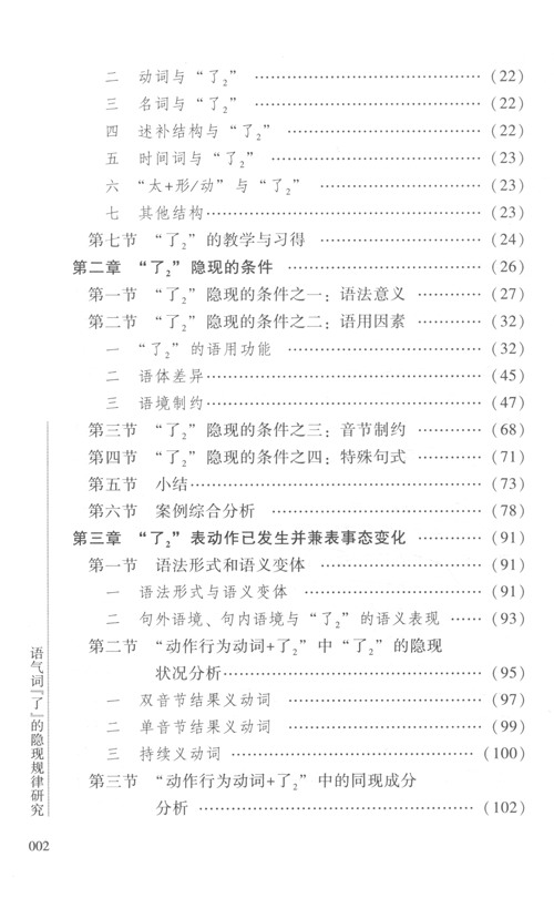 虚词是汉语语法体系中重要的语法手段之一。在虚词中,句末语气词了”(简称“了2”)的使用频率极高。其语义内涵丰富,和其他词语组成的语法句式多种多样,出现规律和语用条件难以把握,所以一直是汉语教学和研究的难点。所谓“了”的隐现问题是指按照语义表达需求,“了2”应该出现时却没有出现。具体表现为有时出现,有时隐匿。“了2”的隐现之所以成为汉语研究中的一道难题,主要原因在于“了2”并不以语义为出现的条件。《语气词“了”的隐现规律研究》的研究表明:语法意义、语用因素(语用功能、语体差异、语境条件)、音节以及某些特殊句式因素都主宰着“了2”的隐现。该书对这些因素及其相互关系进行了深入剖析,逐步揭示了“了2”的隐现规律。另外,作者还以追踪“了2”的隐现规律为线索,在语义、语法、语用三个平面上建立起了一个“了2”的全方位的分布体系,为对外汉语教学提供了可操作性较强的科学依据。