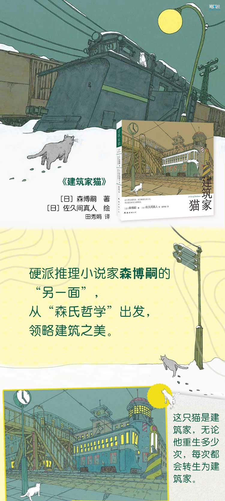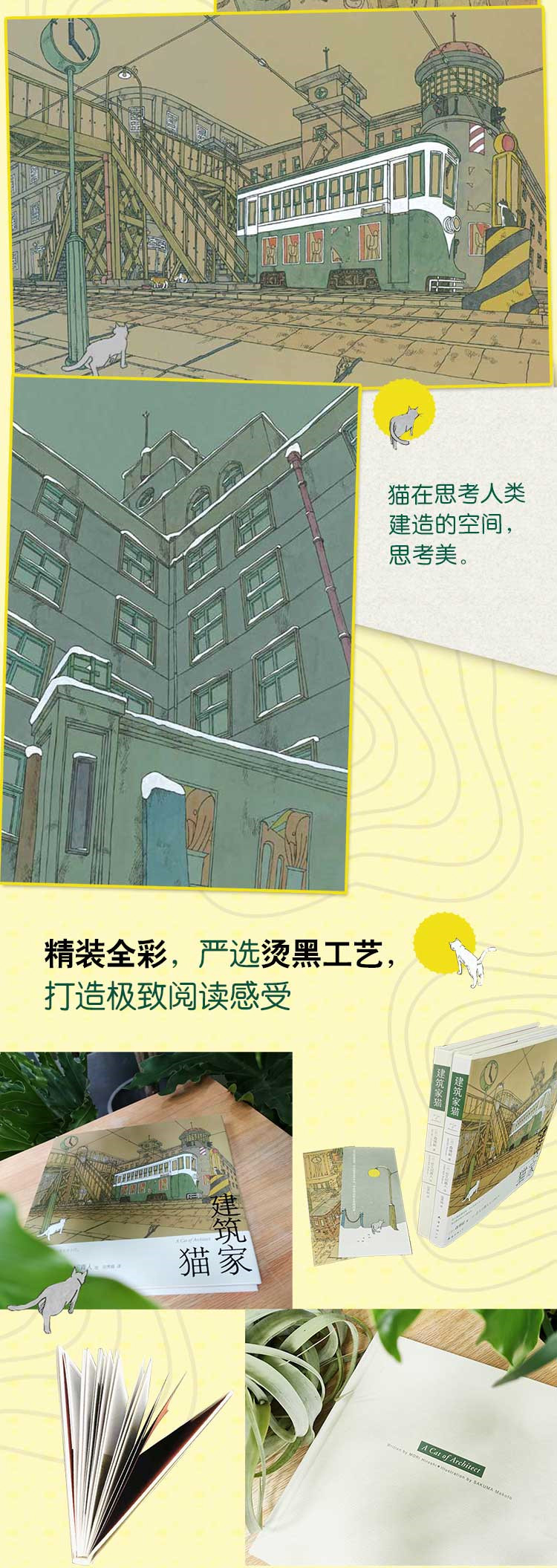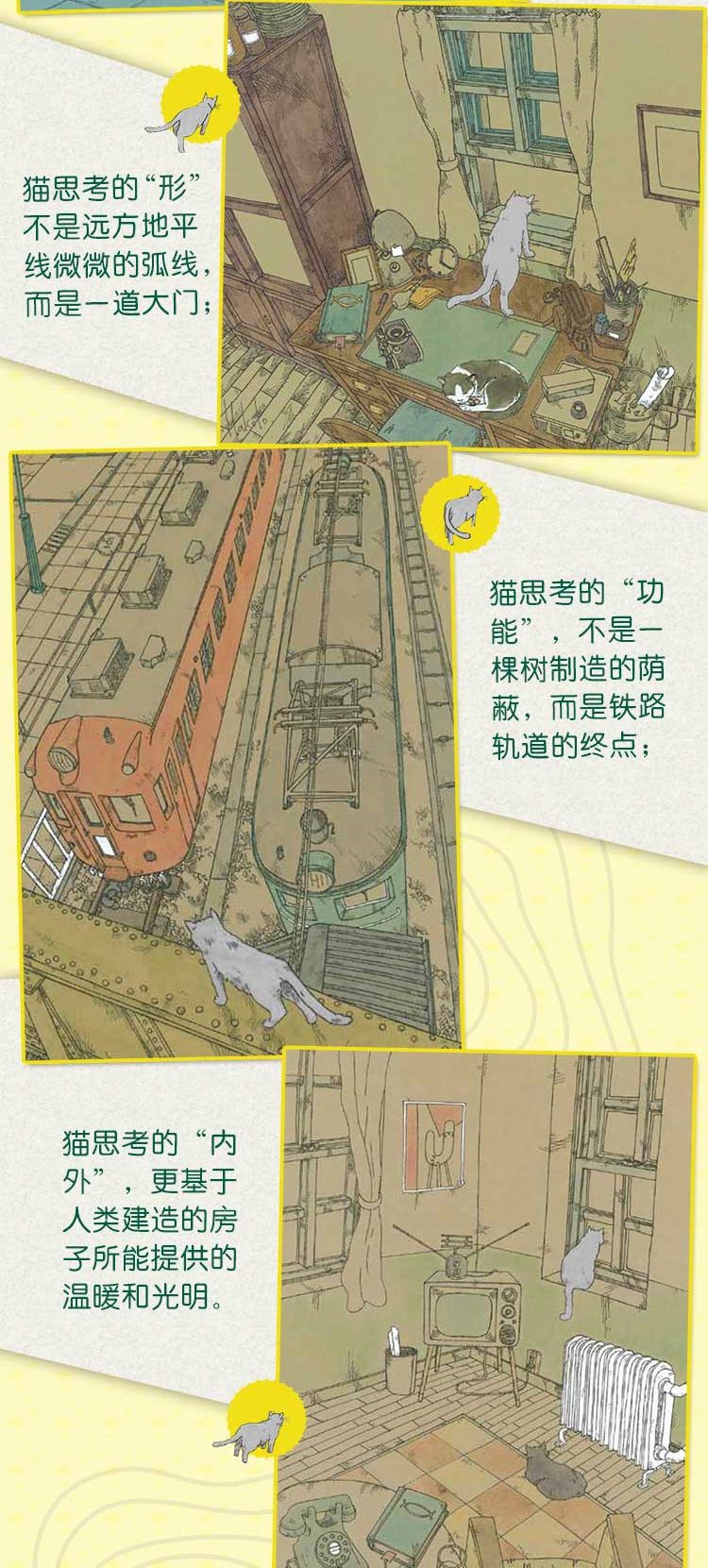 这是一本图文并茂的随笔绘本。作者以猫的视角看待工业文明的城市,以猫每天的生活规律为主线展开。在图画中,可以看到一只灰猫在人类创造的工业世界里穿梭。文字标记了它的心理活动。它思考的“形”,不是远方地平线微微的弧线,而是一道电梯门;它思考的“功能”,不是一棵树制造的荫蔽,而是铁路轨道的终点;它思考的“内外”,更基于人类建造的房子所能提供的温暖和光明。猫在思考人类建造的空间,思考美。