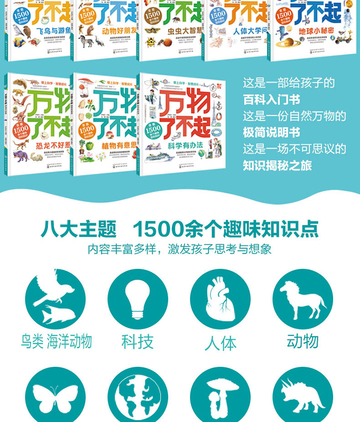 《万物了不起》是一套由专家审阅的、画面精美、知识严谨的儿童百科书,包括《人体大学问》《动物好朋友》《虫虫大智慧》《飞鸟与游鱼》《恐龙不好惹》《地球小秘密》《植物有意思》《科学有办法》8大基础主题,内容前沿、准确,语言简洁、易读,更配有贴心的难字注音,满足孩子自主阅读的需要,在扩充知识量的同时,提升阅读技巧。让孩子在生动活泼的语言中亲近有趣的自然,了解万物的大智慧,并触发孩子的想象力,强化对自然科学知识的记忆,真正爱上科学。