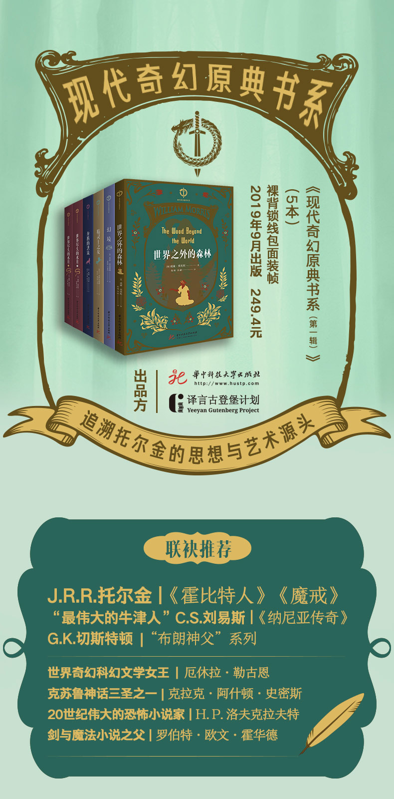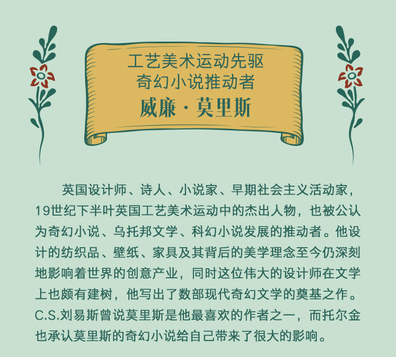 威廉·莫里斯(1834-1896)英国设计师、诗人、小说家、早期社会主义活动家,19世纪下半叶英国工艺美术运动中的杰出人物,也被公认为奇幻小说、乌托邦文学、科幻小说发展的推动者。他设计的纺织品、壁纸、家具及其背后的美学理念至今仍深刻地影响着世界的创意产业,同时这位伟大的设计师在文学上也颇有建树,他写出了数部现代奇幻文学的奠基之作,如《世界尽头的水井》《世界之外的森林》等。 作为欧洲中世纪历史文学的爱好者,莫里斯的小说带着强烈的欧洲中世纪风格——纯粹架空的世界。在莫里斯的奇幻故事中,“我们不再去异国他乡冒险,穿梭在奇怪的梦中,渴望跑到未来”。C.S.刘易斯曾说莫里斯是他喜欢的作者之一,而托尔金也承认莫里斯的奇幻小说给自己带来了很大的影响。