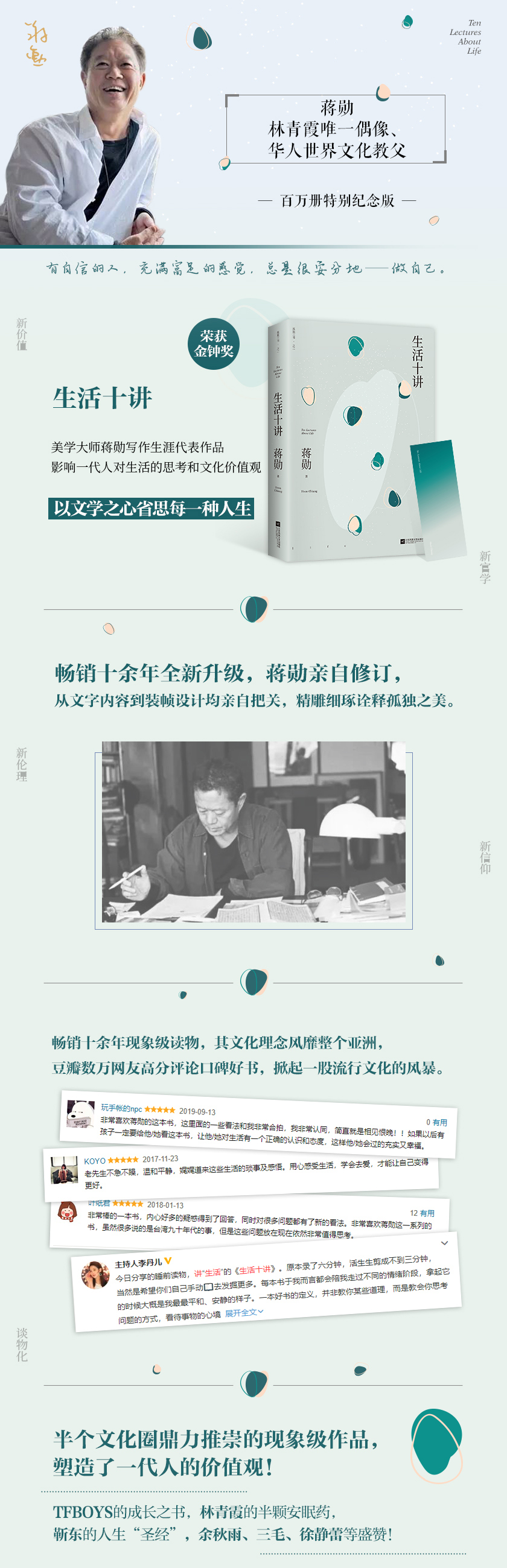 每个人都应有自己的定位和独特的生命价值;要气节,也要性情,要理性,也要幻想;新旧伦理既冲突又融合,更需个人自省和文化规范;信仰是一个自我反省的过程,由此我们可知自己有多贪心、多赖皮、多恐惧;物质和精神的快乐都不可或缺;完满的心灵生活需要神话;人生的过程比结局更为重要;爱是一生的功课;拿掉蒙蔽,就能看到情与欲的真实;学会用心,学会等待,学会放缓脚步;由此我们可以重拾生活的信仰。
