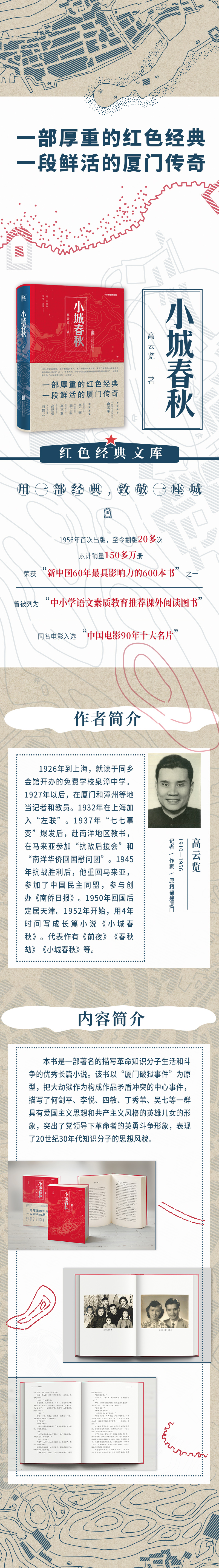 本书是一部著名的描写革命知识分子生活和斗争的优秀长篇小说。建国以来《小城春秋》多次出版印刷,有很大的群众基础,前后印量达到150万册,是一本经典、长销之好书。此次再版首次收录了高云览的妻子及其子女的纪念文章,温情回顾了高云览的创作心路,为读者提供别样的解读视角,并邀请中国著名文艺评论家俞兆平作再版序。