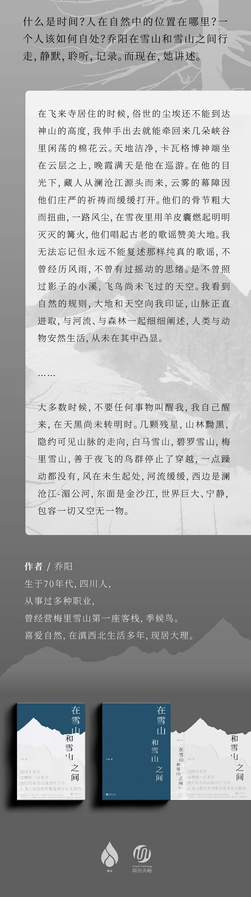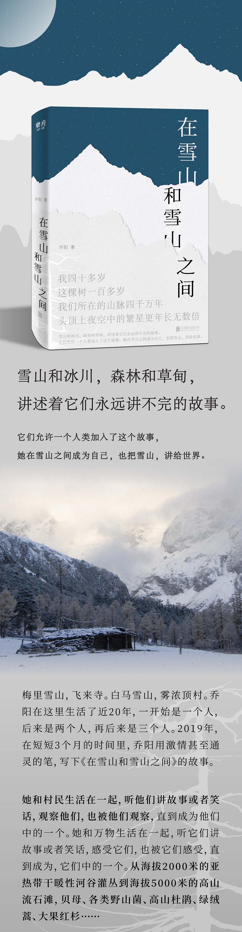 《在雪山和雪山之间》是作者乔阳在云南德钦的雾浓顶村生活了近二十年后写的随笔。她与雪山、与雾浓顶村的村民相处了近二十年。她与北美的自然摄影师威廉博士、滇西植物潘老师一同行走与白马雪山、碧罗雪山和梅里雪山之间,在海拔2000米与5000米之间观察植物与树木之美,思考人与人之间的关系、人在天地间和自然中的位置。这二十年的时间里,她观雪山,发现雪山周边与雪山之间的植物世界,植物物种的兴衰与人类的日常活动、以及经济收益之间的关系。随笔的文字诚实、性情、且美。