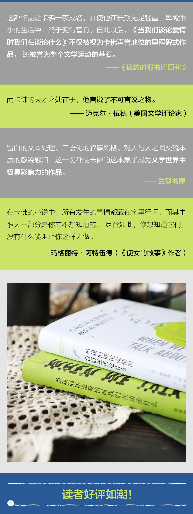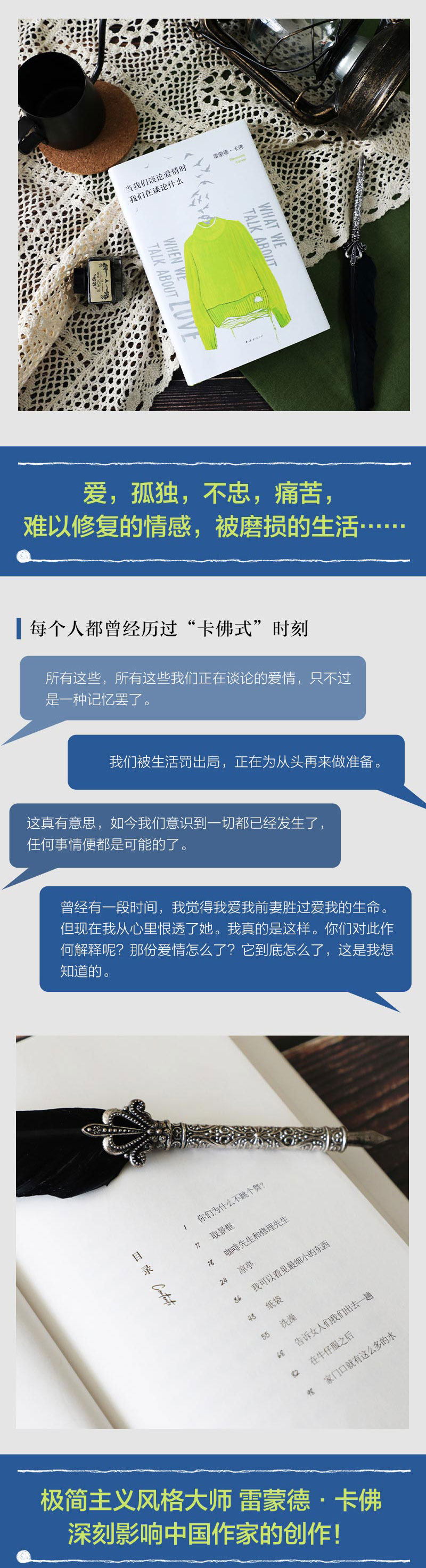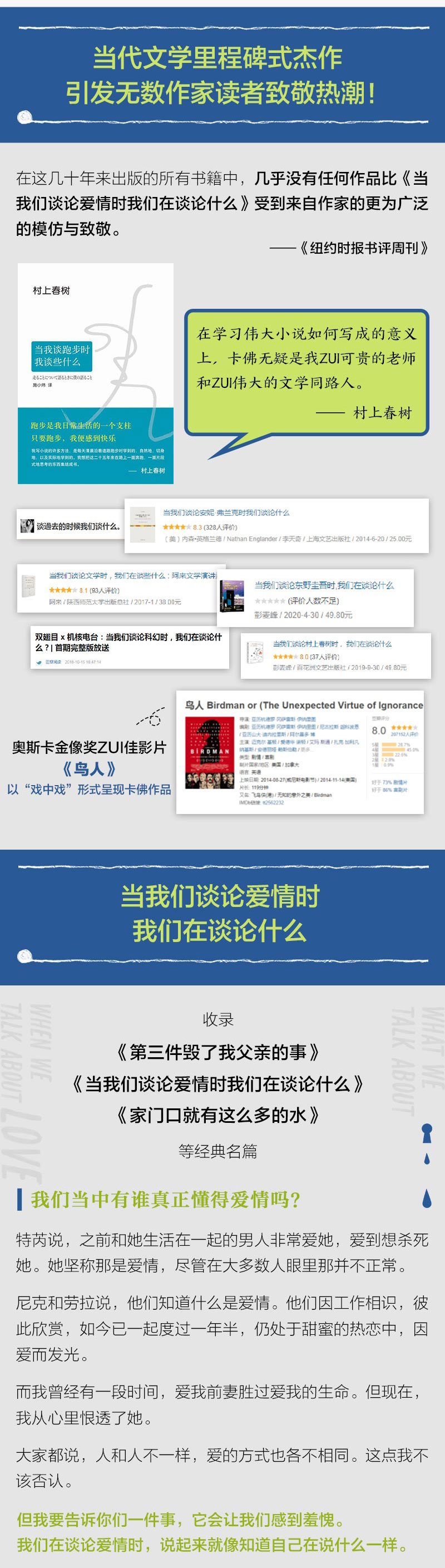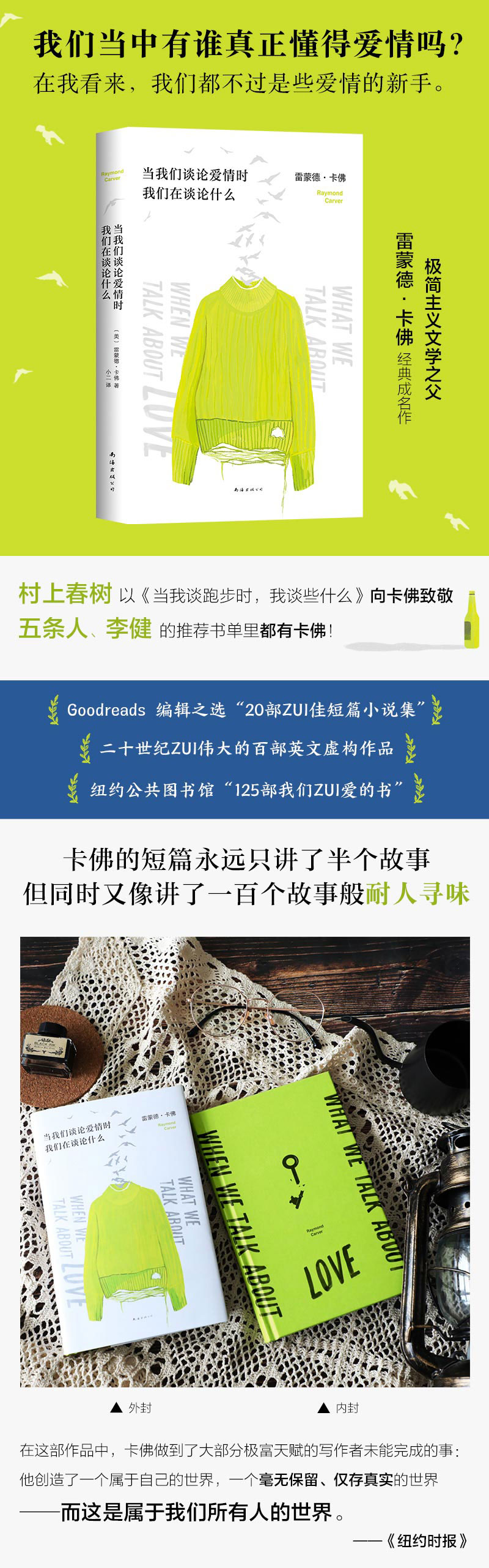 极简主义文学之父雷蒙德·卡佛经典成名作 我们当中有谁真正懂得爱情吗?都不过是些爱情的新手。 村上春树称卡佛为“可贵的老师和伟大的文学同路人”,以《当我谈跑步时,我谈些什么》向卡佛致敬! 五条人、李健倾心的作家!每个人都会在卡佛的文字中读到自己! 讲出来的永远只有半个故事,却像讲了一百个故事般耐人寻味! Goodreads编辑之选“20部佳短篇小说集” 纽约公共图书馆“125部我们爱的书” 二十世纪ZUI伟大的百部英文虚构作品 在遇到雷蒙德·卡佛之前,没有一个作家能称得上我的导师。——村上春树 文学能够让我们明白,像一个人一样活着并非易事。——雷蒙德·卡佛 在这部作品中,卡佛做到了大部分极富天赋的写作者未能完成的事情:他创造了一个属于自己的世界,一个毫无保留、仅存真实的世界——而这是属于我们所有人的世界。——《纽约时报》 我之所以喜欢雷蒙德·卡佛,是因为佩服他对现代普通人生活不凡的洞察力和平等细腻的观察态度,也因为他的同情心与他的文风一样毫不矫饰。——苏童
