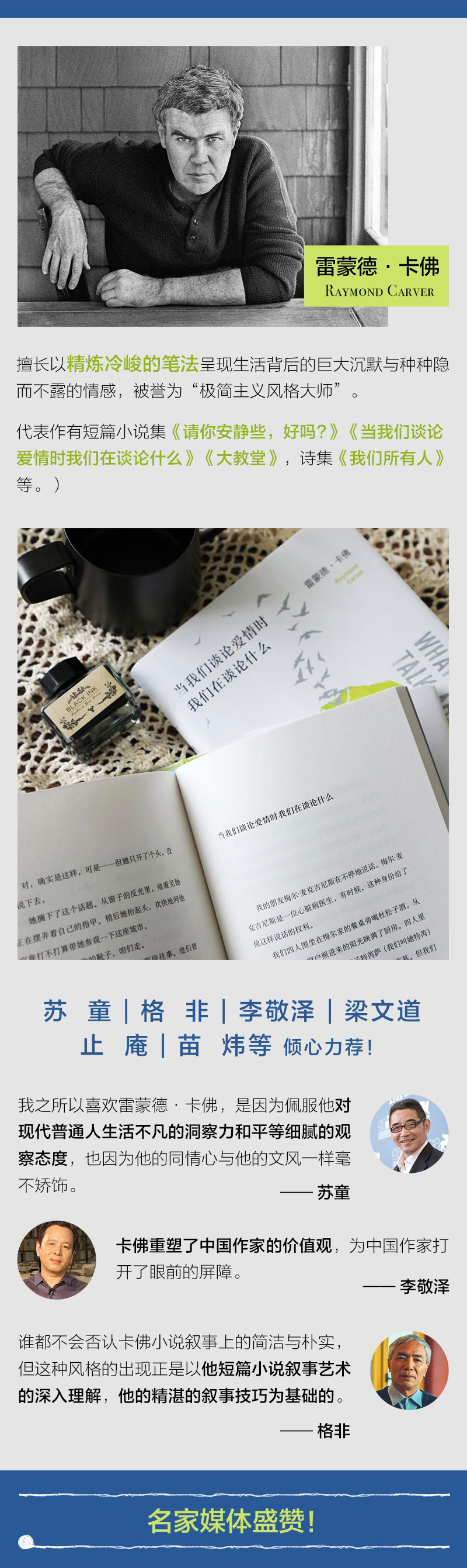 雷蒙德·卡佛(RaymondCarver,1938—1988) 美国作家,擅长以精炼冷峻的笔法呈现生活背后的巨大沉默与种种隐而不露的情感,被誉为“极简主义风格大师”。 代表作有短篇小说集《请你安静些,好吗?》《当我们谈论爱情时我们在谈论什么》《大教堂》,诗集《我们所有人》等。