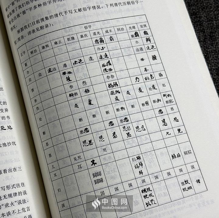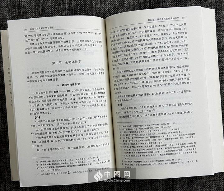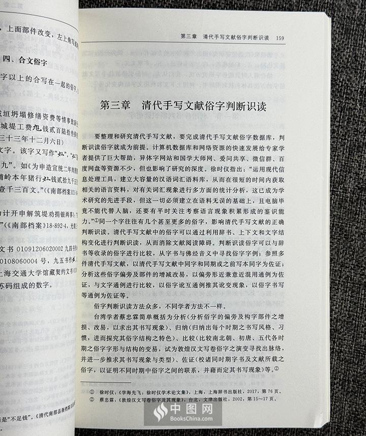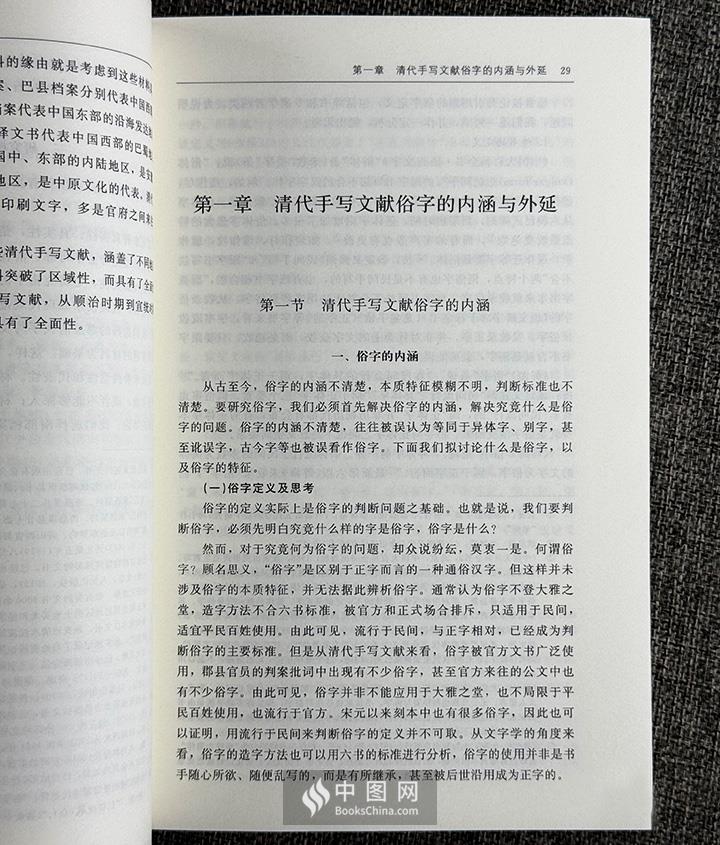 《清代手写文献之俗字研究》一书共六章,包括清代手写文献俗字的内涵与外延,清代手写文献俗字的类型,清代手写文献俗字判断识读,清代手写文献简体俗字,清代手写文献俗字的起源、演变与规范,清代手写文献疑难俗字考释等,附录有清朝俗字一览表和清代历朝俗字索引。该书深入研讨了俗字的内涵与外延,将俗字类型概括为笔画变化俗字、偏旁变化俗字、整字变化俗字等三大类,提出通过查阅辞书、检索俗字索引、阅读上下文语境、分析字形字义等来判断识读俗字,把简体俗字分成全简体俗字、半简体俗字,并对部分疑难俗字进行了考释。
