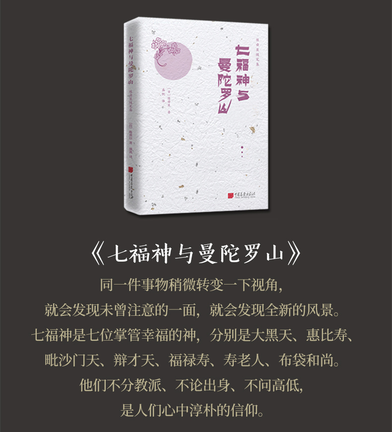 国内开创性地结集出版: 系列书目:《1964年的便笺》《披蝶而舞》《爱唠叨的幸兵卫》《麒麟之志》《随缘护花》《桃李章》《雨过天青 》《三灯书斋》《仙药与鲸》《东眺西望》《史林有声》《九点烟记》《含笑花之树》《英雄长在》《七福神与曼陀罗山》…… 日本的七福神,是七位掌管幸福的神,是融合了神道教、道教、佛教、婆罗门教等来自日本、中国、印度的吉祥天神。他们分别是大黑天、惠比寿、毗沙门天、辩才天、福禄寿、寿老人、布袋和尚。他们不分教派、不论出身、不问高低,是人们心中淳朴的信仰。