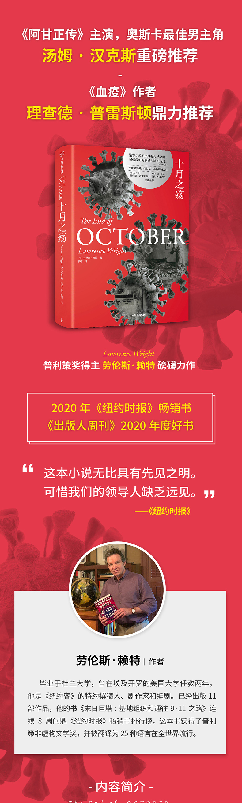 劳伦斯?赖特,《纽约客》特约撰稿人、剧作家和编剧。2007年凭借《末日巨塔:基地组织和通往9·11之路》一书获得普利策非虚构文学奖。其他作品有《上帝拯救得克萨斯》《拨开迷雾:山达基教与信仰囚笼》《九月的十三天:卡特、贝京与萨达特在戴维营》等,曾入围美国国家书评人协会奖和美国国家图书奖等重要奖项。