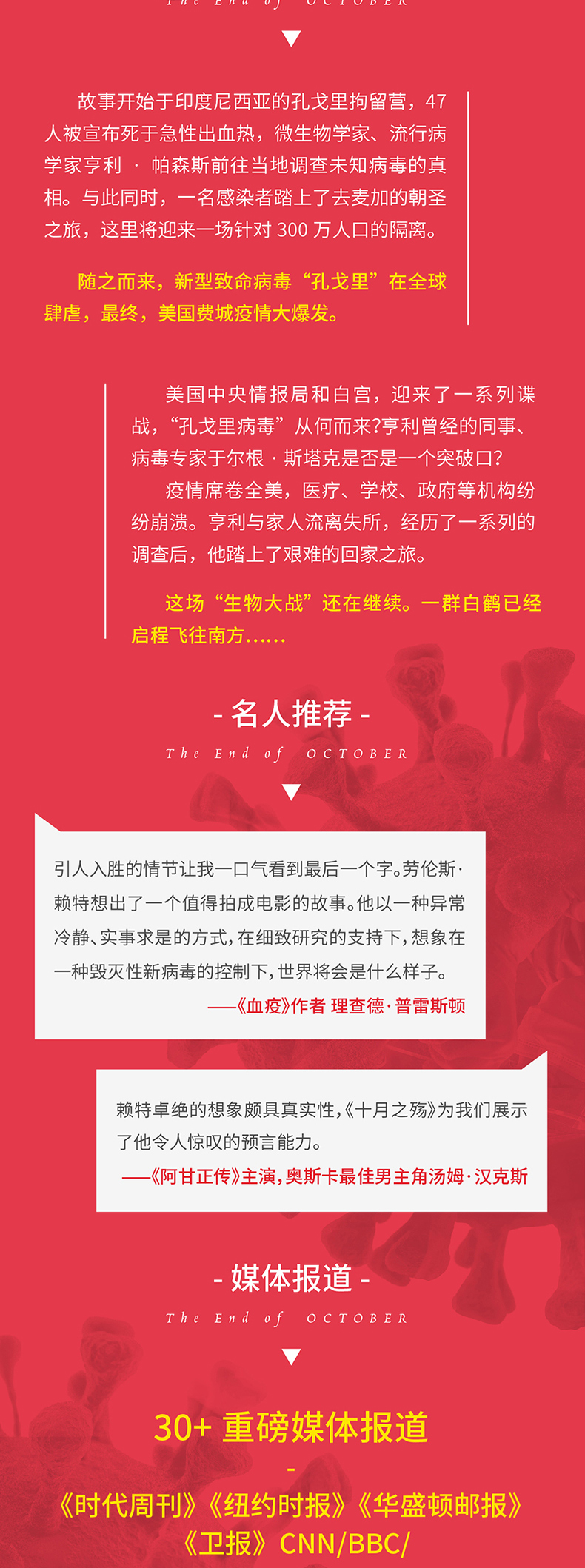 这部小说讲述了一种新型病毒如何肆虐优选……故事开始于印度尼西亚的孔戈里拘留营,47人被宣布死于急性出血热,当微生物学家、流行病学家亨利·帕森斯代表世界卫生组织前往那里进行调查时,他发现了一种传染性极强、传染路径不明以及无法有效医治的病毒“孔戈里病毒”。在麦加一年一度的朝圣活动中,有一名病毒携带者到来,300万人口的城市被隔离。 面对一场大流行病,已经破裂的优选关系开始接二连三地崩溃……疫情席卷全美,医疗、学校、政府等机构纷纷崩溃,人口锐减。为与家人团聚,亨利踏上艰难的回家之路,并期望能在下一波疫情爆发前,揭露疾病大流行的真相….. 作品似乎提前构建了一个“平行世界”,作者说:“当我写这部小说的时候,我知道这有一天会发生,但我没想到会在今天发生。”因其题材及预见性,小说甫一出版,即登上《纽约时报》等多个畅销书榜,《纽约客》《纽约时报》《大西洋月刊》《华盛顿邮报》《科克斯书评》《卫报》,以及CNN、BBC等30余家靠前主流媒体争相报道。小说灵感来自于十年前有名导演雷德利·斯科特的建议,后者也在小说出版后买下了本书的影视版权。
