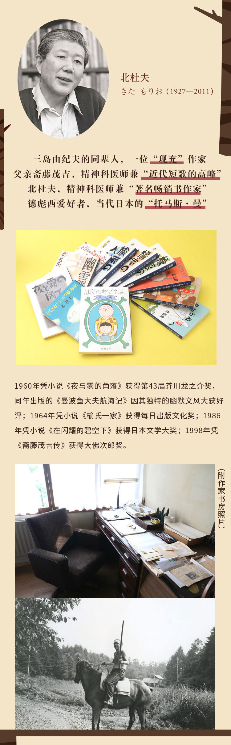 (1927-2011)日本芥川龙之介奖获奖作家,本名斋藤宗吉,日本著名短歌诗人斋藤茂吉的次子,同时也是一名医学博士,精神科医生。出生于日本东京,毕业于东北大学医学部。北杜夫中年之后患有躁郁症,但他仍坚持以幽默的笔触,用一系列的随笔记录了自己的病情。此外,他还创作了很多深受年轻读者追捧的随笔,是位多产的作家。