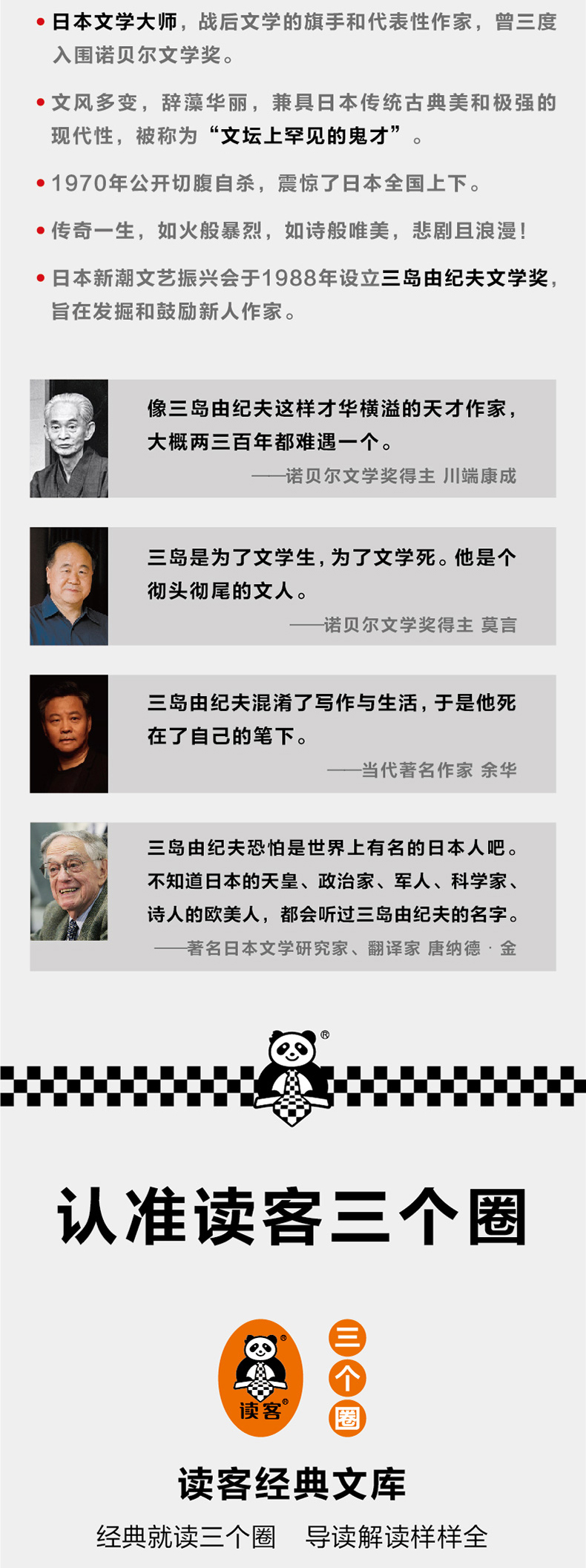 日本文学大师,战后文学的旗手和代表性作家,曾三度入围诺贝尔文学奖。青年时凭借《假面的告白》一举成名,被称为“文坛上罕见的鬼才”。