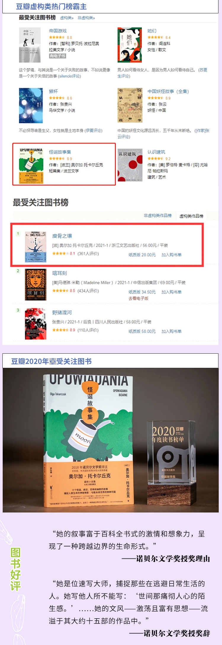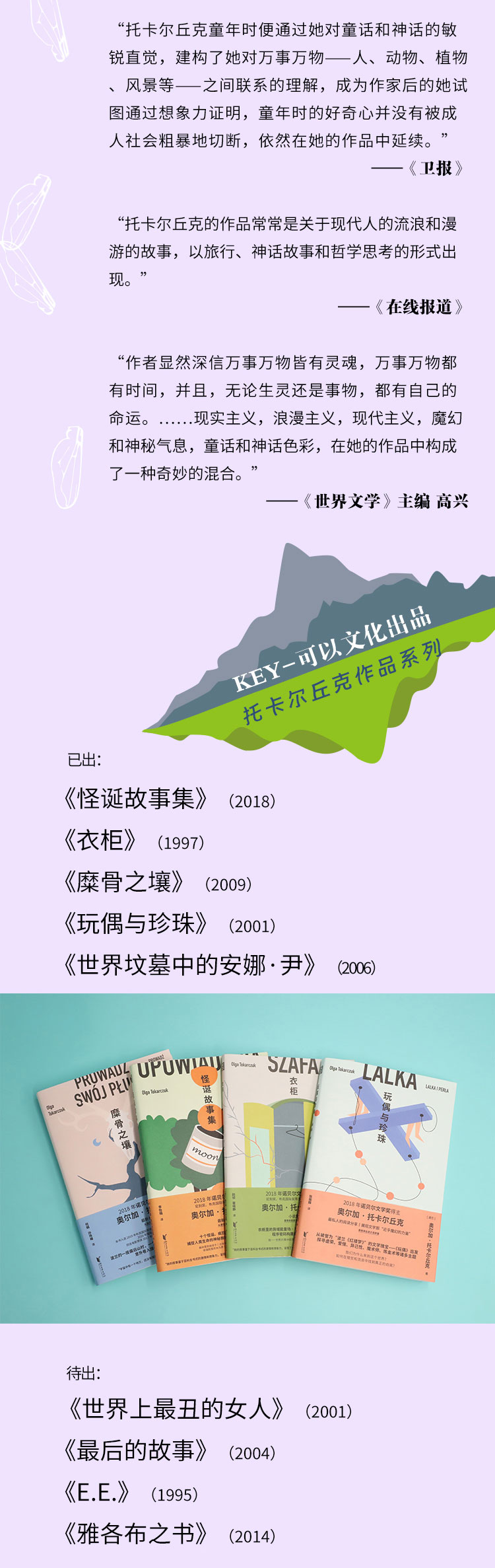 托卡尔丘克生于1962 年,毕业于华沙大学心理学系,1989年凭借诗集《镜子里的城市》登上文坛。代表作有长篇小说《E.E.》(1995)、《太古和其他的时间》(1996)、《白天的房子,夜晚的房子》(1998)、《最后的故事》(2004)、《世界坟墓中的安娜·尹》(2006)、《云游》(2007)、《犁过亡者的尸骨》(2009)、《雅各布之书》(2014);小说集《衣柜》(1997)、《世界上最丑的女人》(2001)、《怪诞故事集》(2018);散文《玩偶与珍珠》(2001)等。