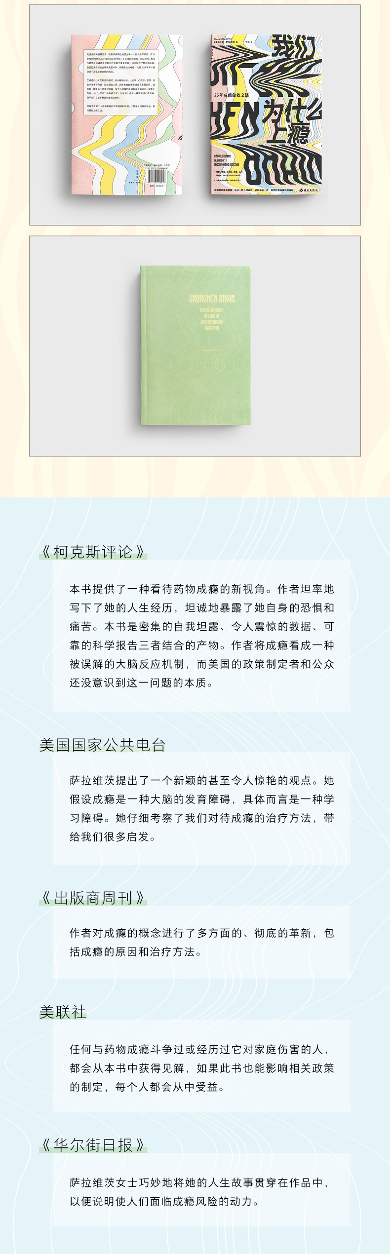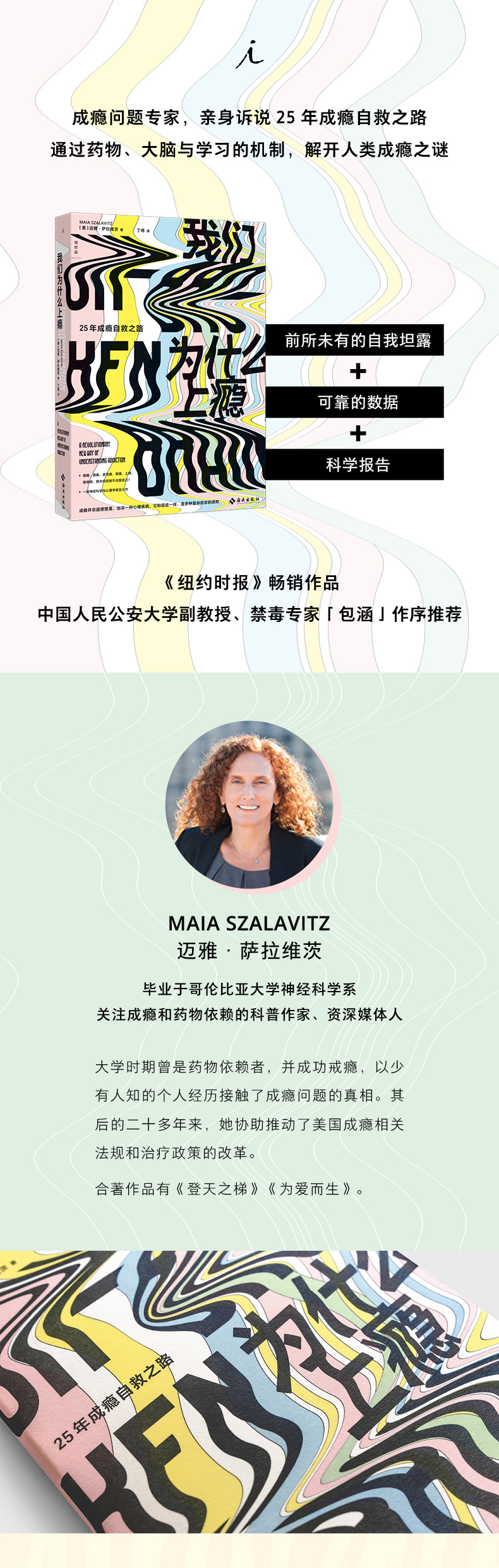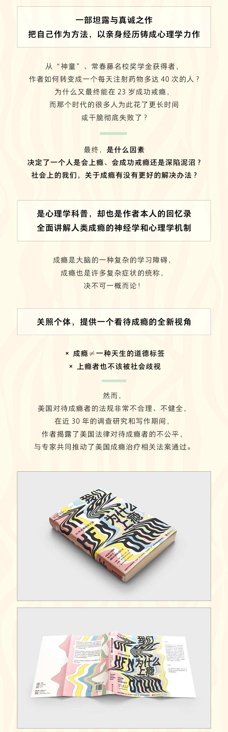 【图书版次以实际收到为准】1.25年成瘾自救之路,以亲身经历写成的心理学力作:哥伦比亚大学神经学专业高材生、成瘾问题研究者、资深媒体人25年成瘾自救之路,以科学理论加生动案例,全面讲解人类成瘾的神经学和心理学机制原来,成瘾是大脑的一种复杂的学习障碍,成瘾也是许多复杂症状的统称,决不可一概而论。2.关心成瘾者个体,揭露美国法律对待成瘾者的不公平:成瘾并非一种天生的道德标签,上瘾者也不应该被社会歧视。出于历史、文化与社会原因,20世纪80年代之前,美国对待药物成瘾者的法规体系非常不合理、不健全,导致了无数个人与家庭的悲剧。每个成瘾需要具体被关心和对待,由社会和家庭协助他们戒瘾成功。在近30年对成瘾的调查研究和写作期间,作者与其他专家一起推动了美国成瘾治疗相关法案通过,保护了许许多多成瘾者的身心健康。3.一部坦露与真诚之作:虽是一本心理学科普,却是用作者本人的回忆录来讲述。作者出身优渥,从小天资聪颖,却在青春期后深陷环境造成的药物上瘾泥潭,但是她也通过坚强的意志、积极的学习与家人的支持重回正轨,并且终解开成瘾的谜题,改变了美国社会的某些阴暗面。一个被成瘾折磨多年的患者,发自真诚的自我坦白,唤起药物成瘾弱势群体的共鸣,令人信服。