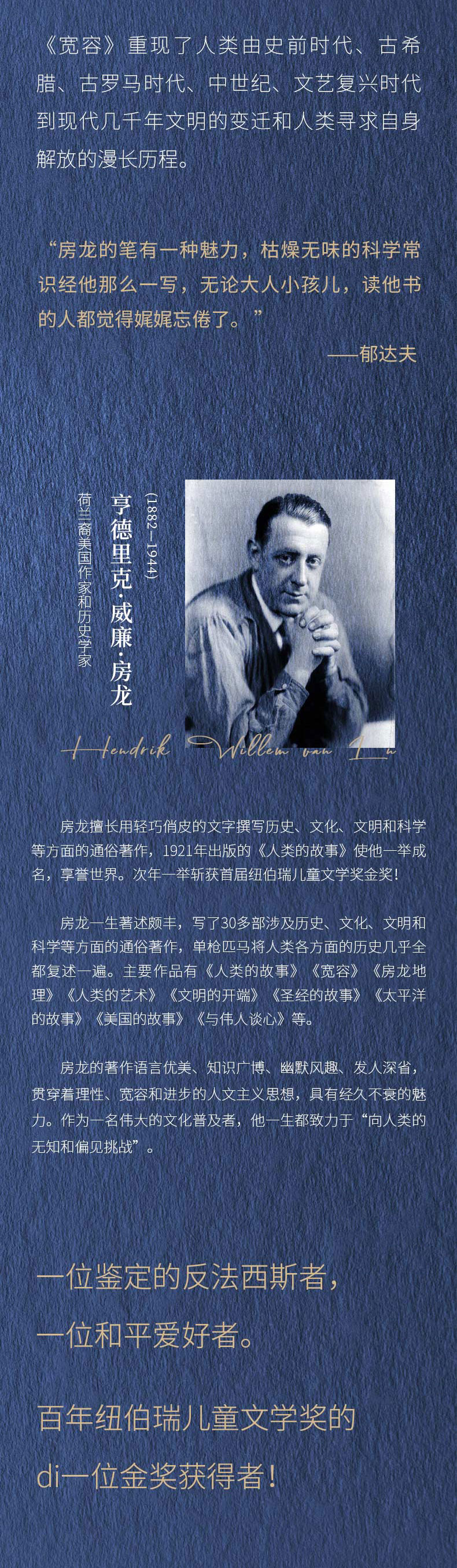 亨德里克·威廉·房龙(Hendrik Willem van Loon,1882—1944),荷兰裔美国作家和历史学家。房龙擅长用轻巧俏皮的文字撰写历史、文化、文明和科学等方面的通俗著作,1921年出版的《人类的故事》使他一举成名,享誉世界。次年一举斩获首届纽伯瑞儿童文学奖金奖!