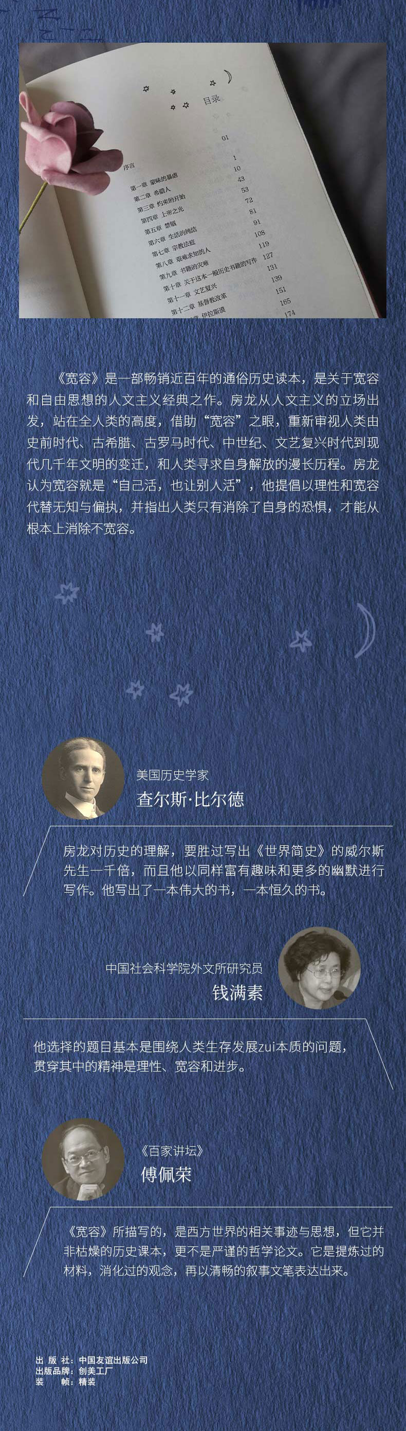 《宽容》是一部畅销近百年的通俗历史读本,是关于宽容和自由思想的人文主义经典之作。房龙从人文主义的立场出发, 站在全人类的高度,借助“宽容”之眼, 重新审视人类由史前时代、古希腊、古罗马时代、中世纪、文艺复兴时代到现代几千年文明的变迁,和人类寻求自身解放的漫长历程。房龙认为宽容就是“自己活,也让别人活”,他提倡以理性和宽容代替无知与偏执,并指出人类只有消除了自身的恐惧,才能从根本上消除不宽容。