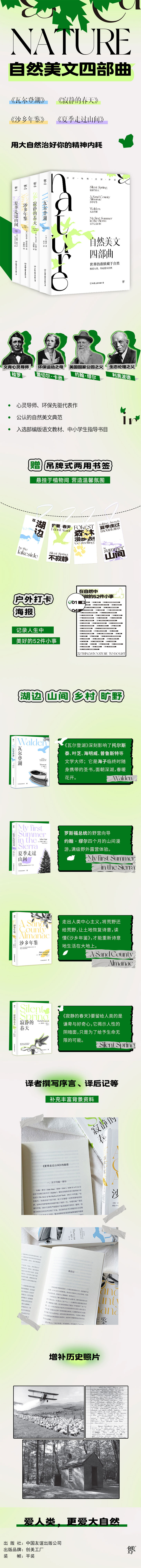 “自然美文四部曲”包含《瓦尔登湖》《寂静的春天》《沙乡年鉴》《夏季走过山间》,是公认的自然美文典范。