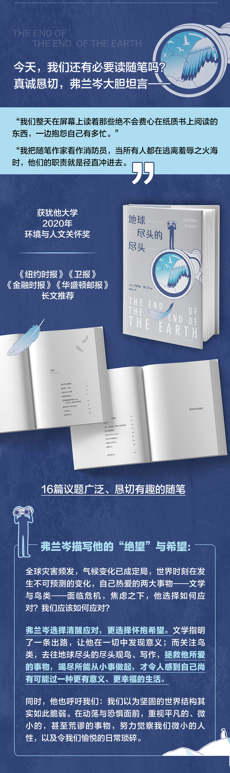 弗兰岑选择清醒应对,更选择怀抱希望。文学指明了一条出路,让他在一切中发现意义;而关注鸟类,去往地球尽头的尽头观鸟、写作,拯救他所爱的事物,竭尽所能从小事做起,才令人感到自己尚有可能过一种更有意义、更幸福的生活。