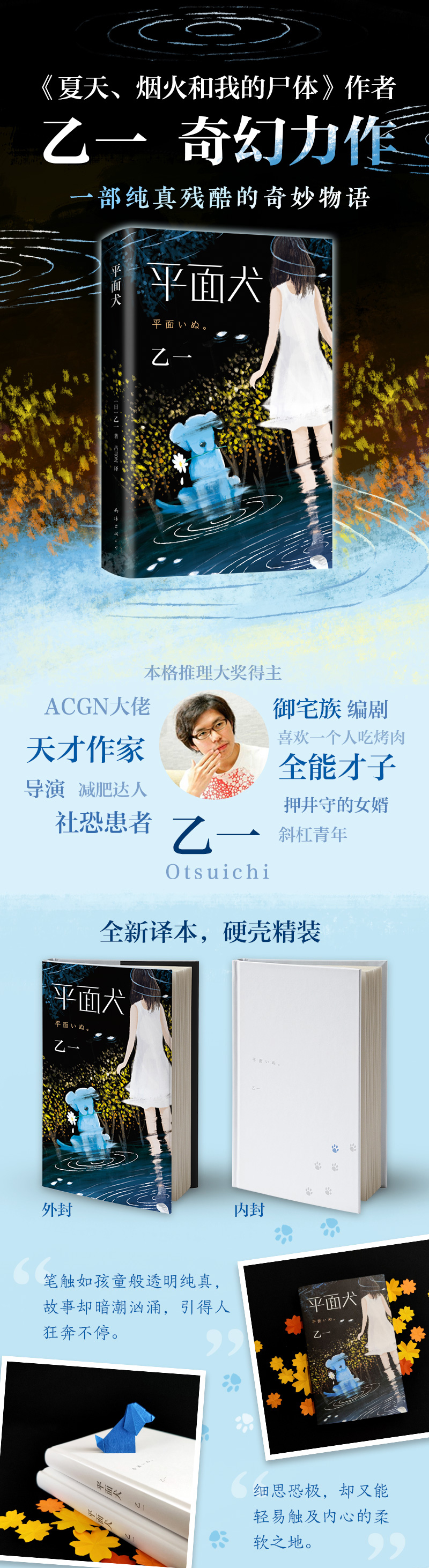 《平面犬》是16岁轰动日本文坛的天才作家乙一的代表作,包含《石眼》《小初》《布鲁》《平面犬》四篇小说。《平面犬》是一部纯真而残酷的奇妙物语,悬念迭起的故事萦绕着诡谲的氛围,但也盈满人世间的动人情感。 《平面犬》故事简介: 我在胳膊上刺了一条蓝色小狗。它有疑问似的歪着脑袋,嘴里叼着一朵白花。我小心地用袖子遮住它,它却在我打工时乱叫,还跑到我的肚皮上睡觉,一点儿也不听话。 我的家人得了绝症,想到要一个人活下去,我害怕极了。我连自己都照顾不好,怎么能养活一条狗呢?我决定把狗送人,在网上留下了信息: 名字叫百奇,雄性,身长三厘米,毛是蓝色的…… 会有人想收留一条贪吃调皮、在皮肤上跑来跑去的小狗吗? 然而,刚发出消息一会儿,我就得到了回应——想救家人的话,就和狗一起来吧!