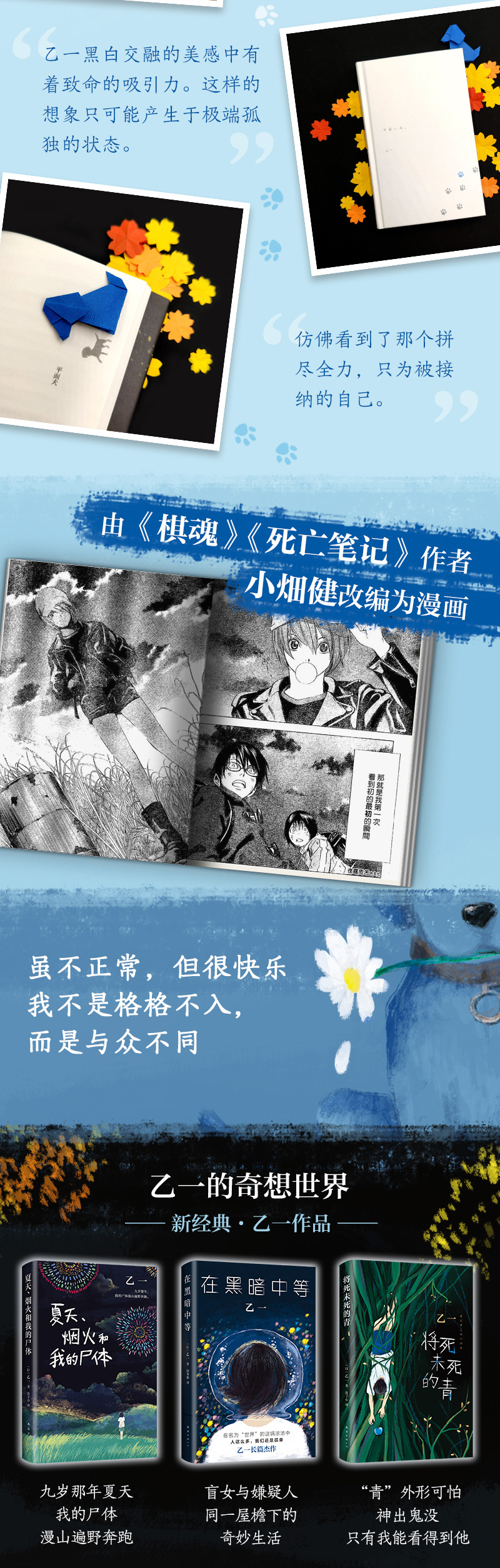 《夏天、烟火和我的尸体》作者乙一奇幻力作 那个夏天,我把妈妈的腿弄丢了 一部纯真残酷的奇妙物语,豆瓣8.5分口碑推荐 一本写进你心坎的书:虽不正常,但很快乐。我不是格格不入,而是与众不同 张震、李艺彤、田燚、胡春杨都在读的“宝藏作家” 乙一的作品风格强烈而独特,写尽人性丑恶,让人不寒而栗,又会在淡淡的凄凉中,透露一丝温情与希望。——凤凰网 封面由知名设计师手绘,内外双封,硬壳精装典藏