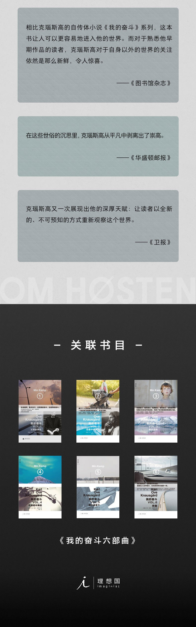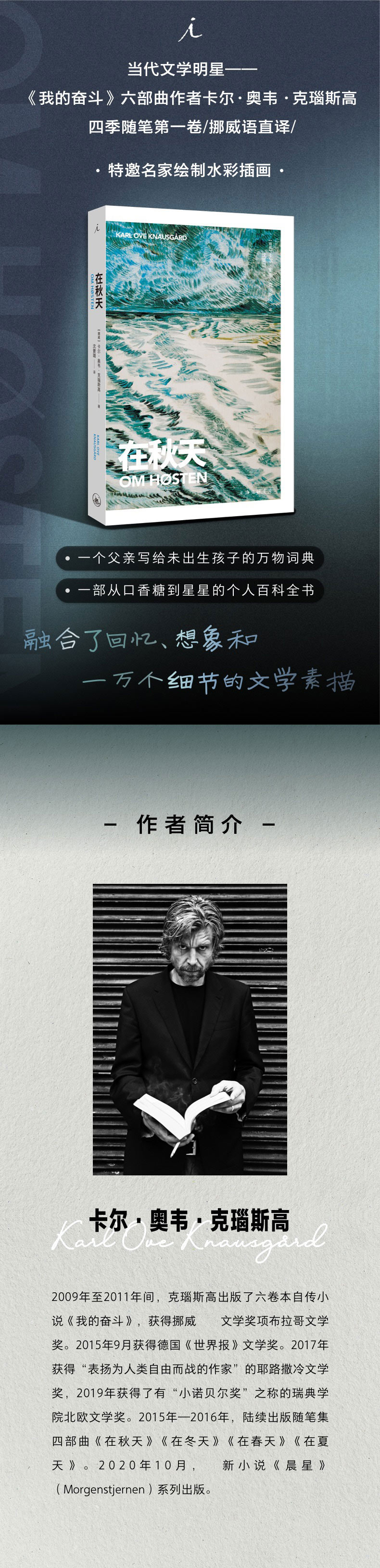 卡尔·奥韦·克瑙斯高(Karl Ove Knausg?rd),1968年生于挪威奥斯陆。1998年以首部小说《出离世界》(Ute av verden)获得挪威文学评论奖,2004年第二部小说《万物皆有时》(En tid for alt)又获得北欧文学奖。2009年至2011年间,克瑙斯高出版了六卷本自传小说《我的奋斗》(Min Kamp),获得挪威蕞高文学奖项布拉哥文学奖。在挪威,每十个人就有一人读过《我的奋斗》。知名作家莉迪亚·戴维斯、扎迪·史密斯、杰弗里·尤金尼德斯、乔纳森·勒瑟姆等也表示读《我的奋斗》成瘾,迫不及待地一本接一本读下去。2015年9月,克瑙斯高获得德国《世界报》文学奖(Welt-Literaturpreis,2014年得主是村上春树)。2015年—2016年,陆续出版随笔集四部曲《在秋天》《在冬天》《在春天》《在夏天》。2020年10月,蕞新小说《晨星》(Morgenstjernen)系列出版。