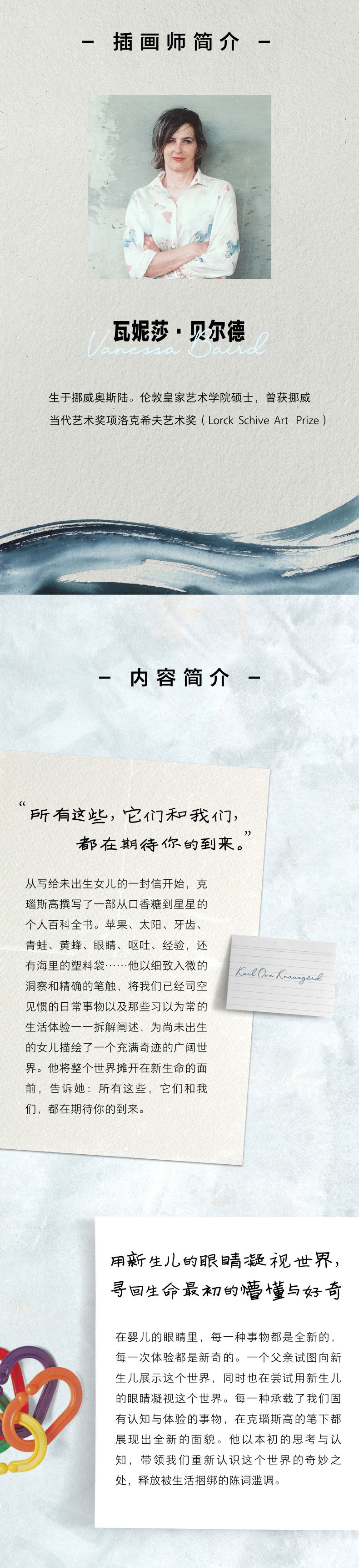 ★ 用新生儿的眼睛凝视世界,寻回生命蕞初的懵懂与好奇——在婴儿的眼睛里,每一种事物都是全新的,每一次体验都是新奇的。一个父亲试图向新生儿展示这个世界,同时也在尝试用新生儿的眼睛凝视这个世界。每一种承载了我们固有认知与体验的事物,在克瑙斯高的笔下都展现出全新的面貌。他以本初的思考与认知,带领我们重新认识这个世界的奇妙之处,释放被生活捆绑的陈词滥调。