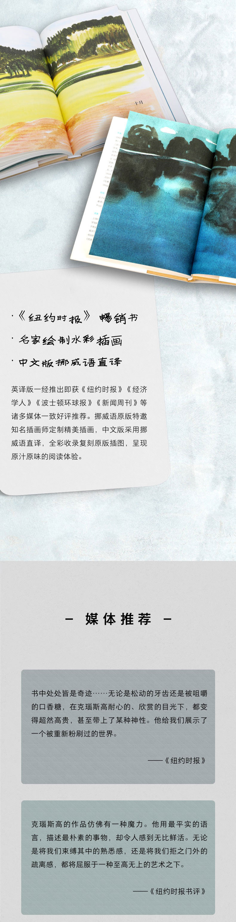 ★ 《纽约时报》畅销书,数十家媒体一致好评推荐;名家绘制水彩插画随书精美呈现——英译版一经推出即获《纽约时报》《经济学人》《波士顿环球报》《新闻周刊》等诸多媒体一致好评推荐。挪威语原版特邀知名插画师定制精美插画,中文版采用挪威语直译,全彩收录复刻原版插图,呈现原汁原味的阅读体验。