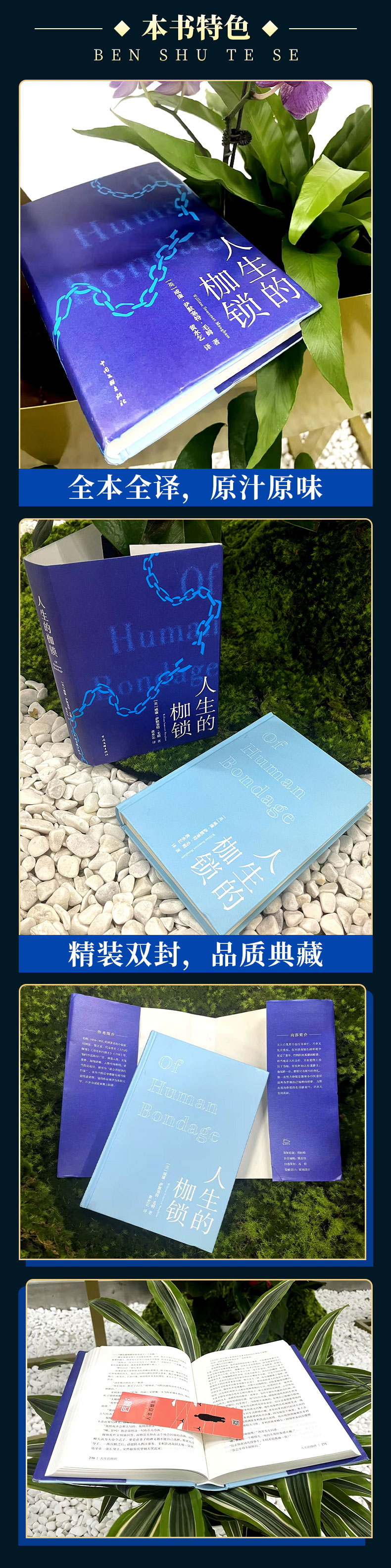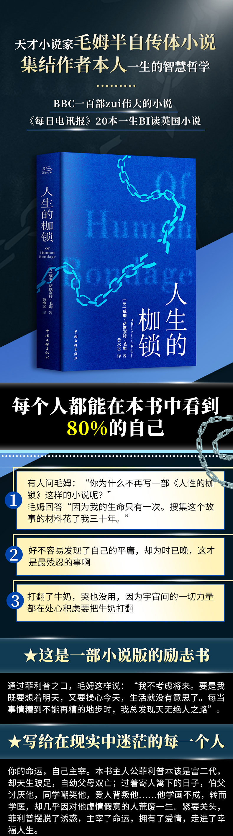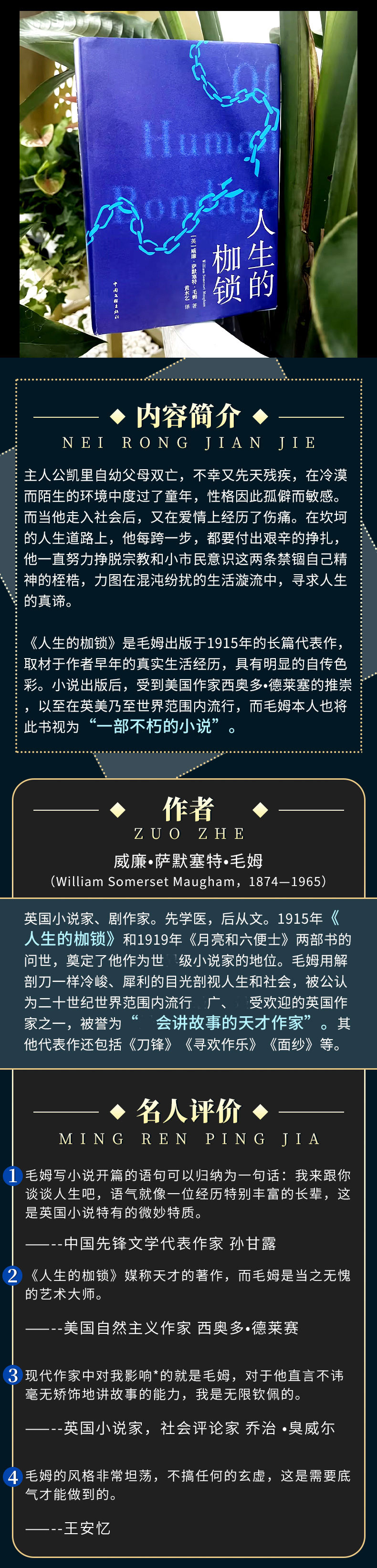 《人生的枷锁》部分取材于毛姆早年的真实生活经历,由作者精心构思十数年创作而成,处处透着作者对人生、艺术、信仰的探讨,奠定了毛姆在英国文坛的地位。主人公菲利普出身于上层社会,却自幼父母双亡,而且先天跛足,在冷漠的寄居生活中度过了童年,又寄宿在满是虚伪氛围的皇家公学。步入社会后,他开始学习绘画,觉得自己没有天分后转而学医,却几乎为了一个不值得爱的人荒废学业。饱尝世态炎凉、大彻大悟之后,他摆脱了情欲纠缠,放弃了周游世界这个不切实际的梦想,决定和一直照顾、疼爱自己的女子萨利一起生活。这是一部小说版的励志书。通过菲利普之口,毛姆这样说:“我不考虑将来。要是我既要想着明天,又要操心今天,生活就没有意思了。每当事情糟到不能再糟的地步时,我总发现天无绝人之路”。