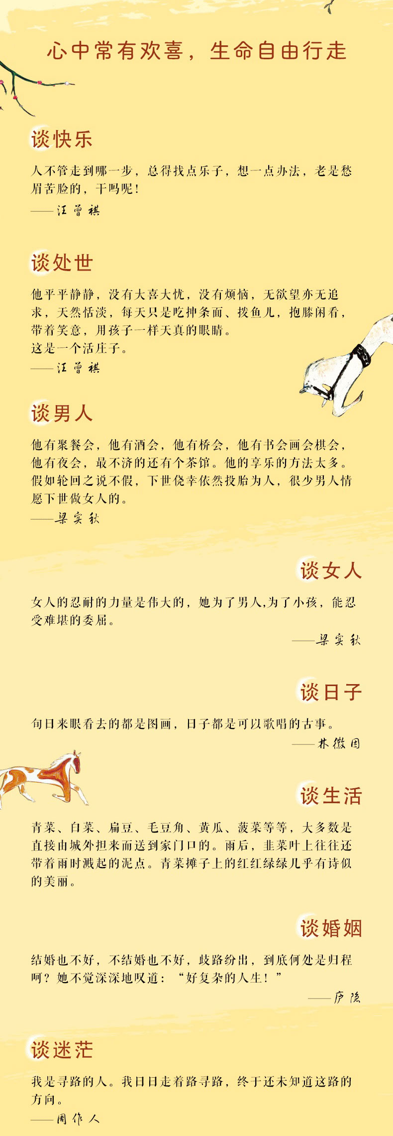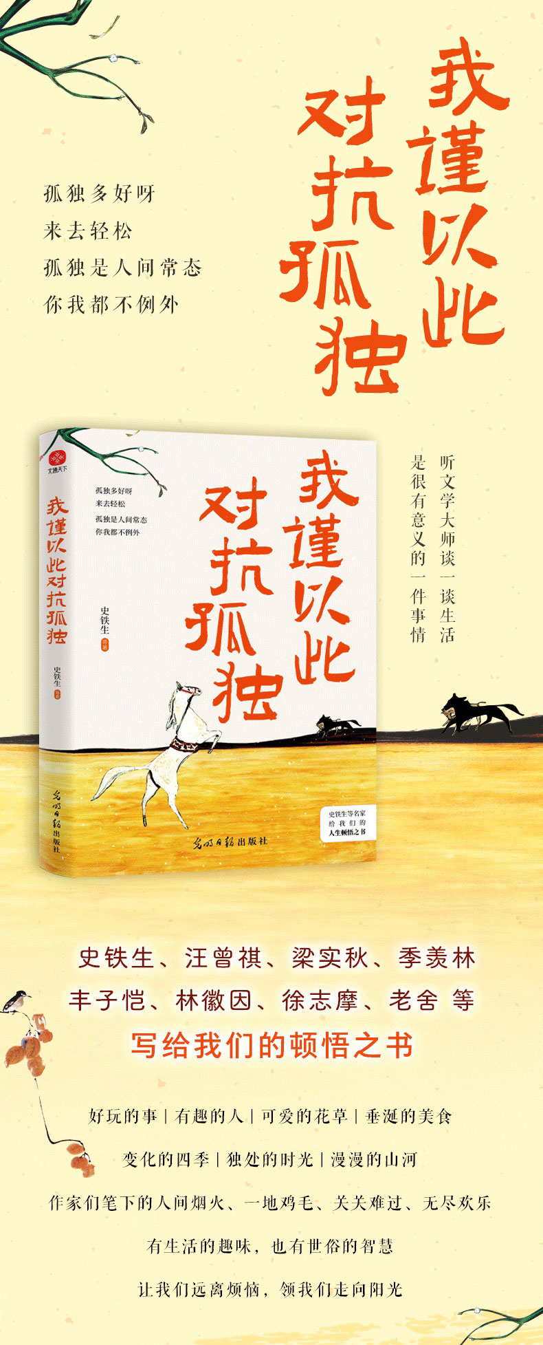 这是一本关于超越孤独、悦纳生活、生命丰盛的散文集。收录史铁生、汪曾祺、季羡林、梁实秋、丰子恺、林徽因、徐志摩、老舍、郁达夫、周作人、郑振铎、朱自清、庐隐、胡适等十四位知名作家的散文作品。作家们在书中谈闲暇、谈美食、谈草木、谈世间相、谈远方、谈亲朋、谈生活、谈人生,谈哲理,普通人的人间烟火、一地鸡毛、关关难过、无尽欢乐,作家们都经历过,他们的体验和感悟让我们收获内心的治愈和感动,勇气和力量,心中常有欢喜,生命自由行走。