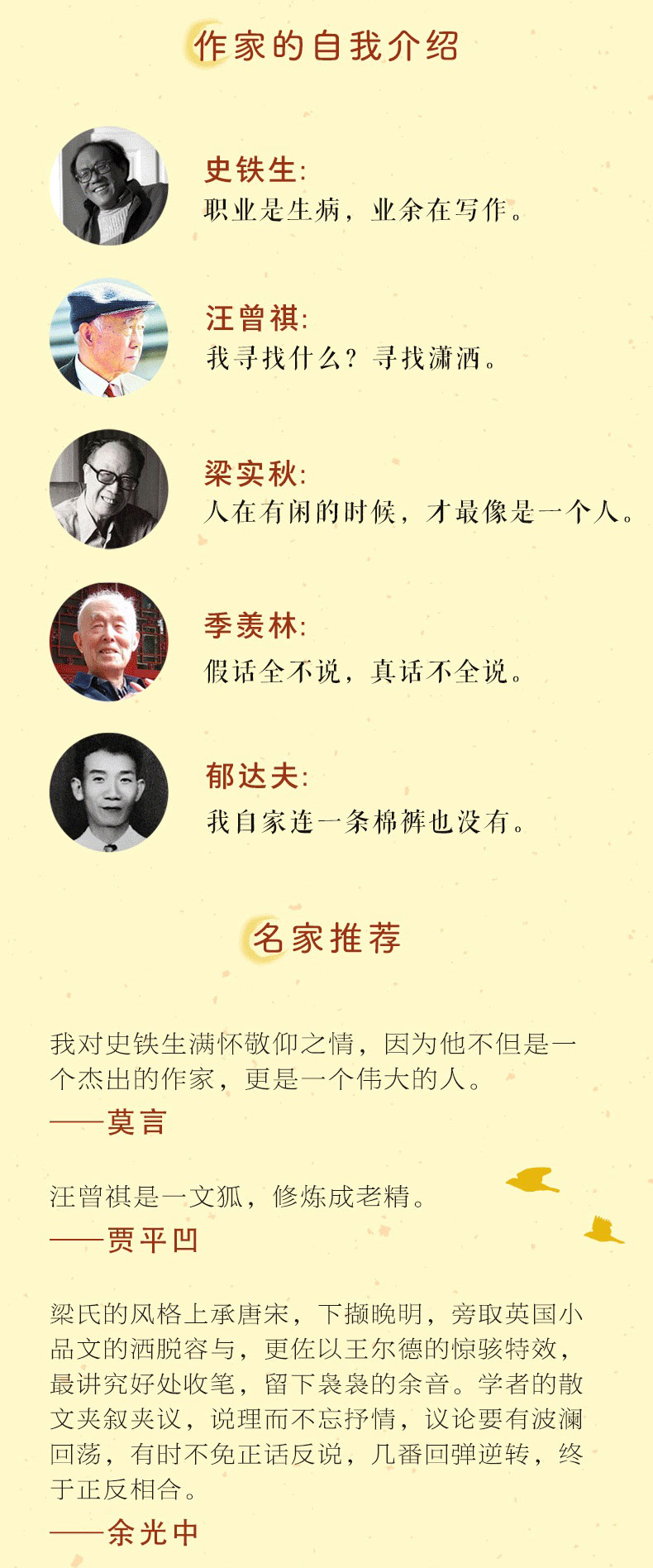 2、收录史铁生、汪曾祺、梁实秋、季羡林、丰子恺、林徽因、徐志摩、老舍、郁达夫、周作人、郑振铎、朱自清、庐隐、胡适等华语文坛14位知名作家的知名文章。