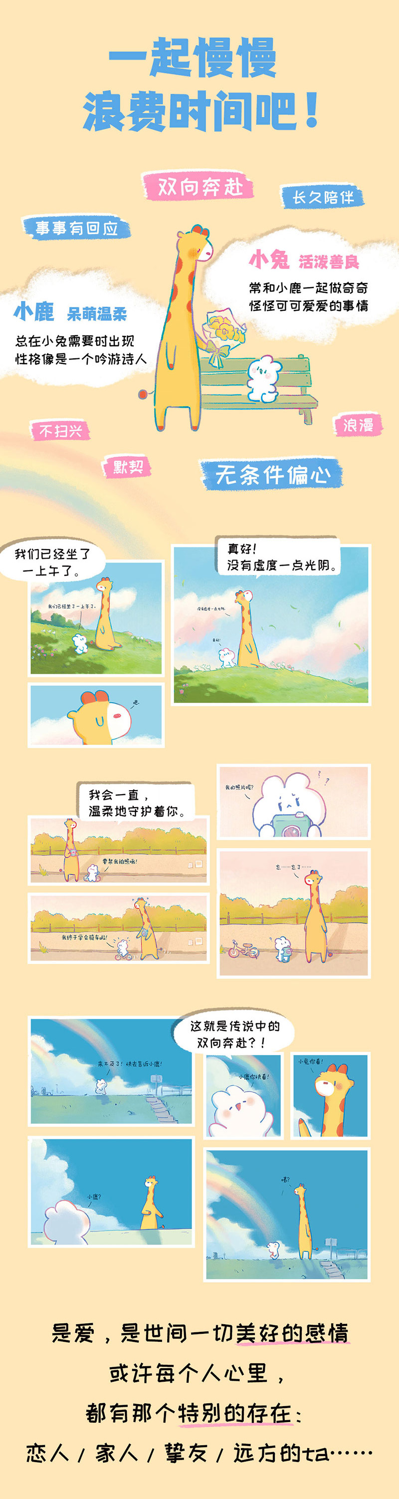 本书讲述小兔与小鹿相遇、相互陪伴,渐渐成为彼此特别的人的温暖故事。偏爱是什么?是我待你与待世界不同,是我对你与对别人不同,是无理由的相信,无条件的支持,是你知道自己在这世上还有一个永远会偏向自己的人;是和你在一起享受美食才开心,是和你在一起才有说不完的话,是会吃下你做的难吃的饭,是不想和别人撑伞、只想跟你一起淋雨,是安静地并肩看夕阳,也不感到尴尬。和你一起浪费了那么多生命,我觉得自己好奢·侈,可你给了我那么多的爱,又让我觉得自己好富有。