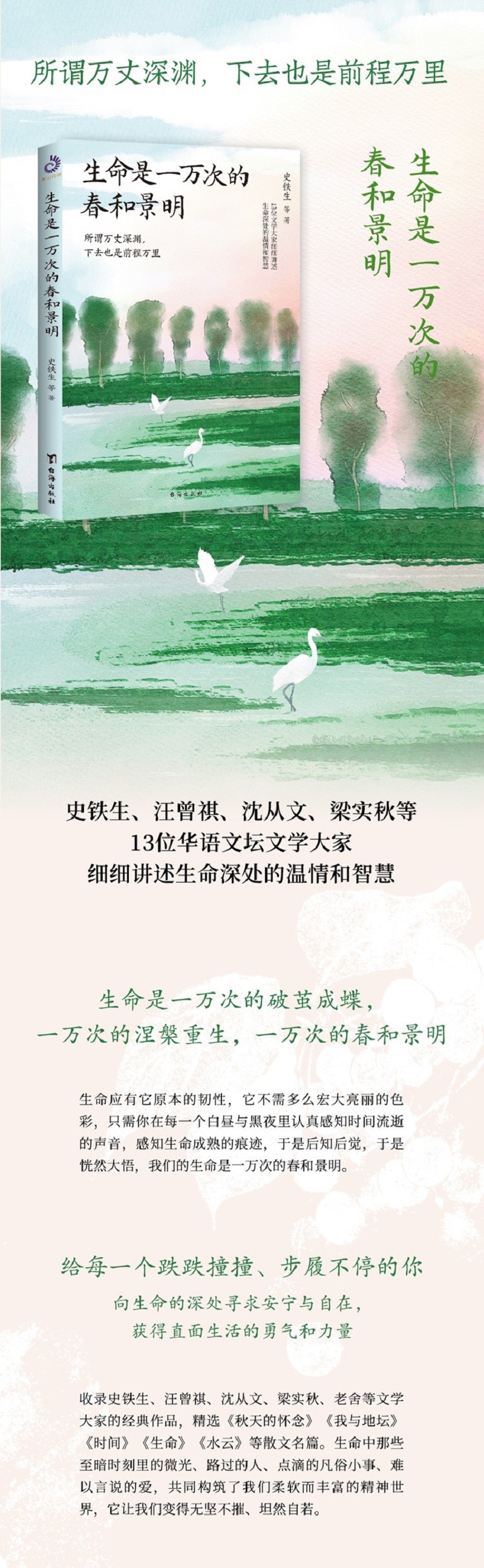 本书收录史铁生、汪曾祺、沈从文、梁实秋、老舍等文学大家的经典作品,精选《秋天的怀念》《我与地坛》《时间》《生命》《水云》等散文名篇。生命中那些至暗时刻里的微光、路过的人、点滴的凡俗小事、难以言说的爱,共同构筑了我们柔软而丰富的精神世界,它让我们变得无坚不摧、坦然自若。