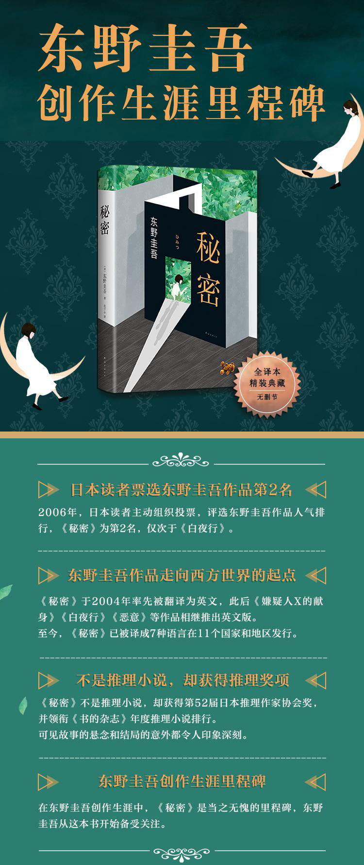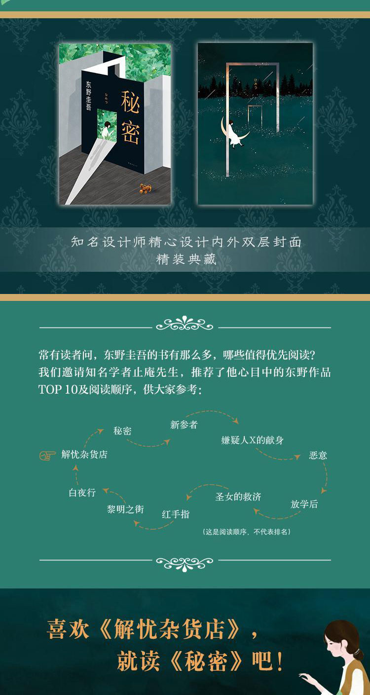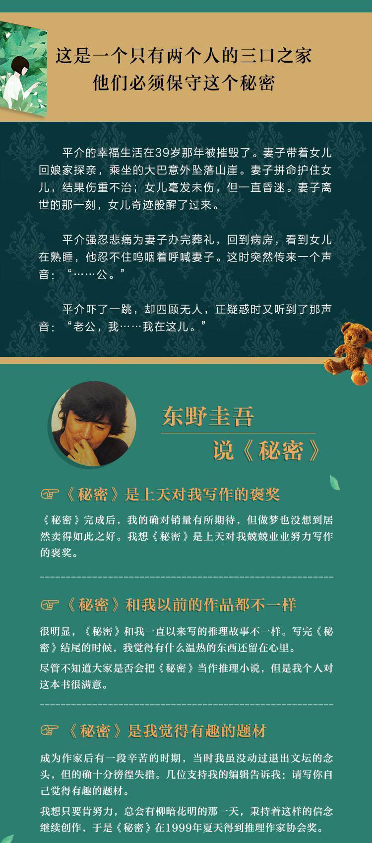 《秘密》是东野圭吾的长篇小说代表作,创作生涯里程碑作品,在众多读者心目中仅次于《白夜行》。东野曾说:“《秘密》是上天对我兢兢业业努力写作的褒奖。”如果用一句话来总结《秘密》讲述的故事,那就是:这是一个只有两个人的三口之家,他们必须保守这个秘密。