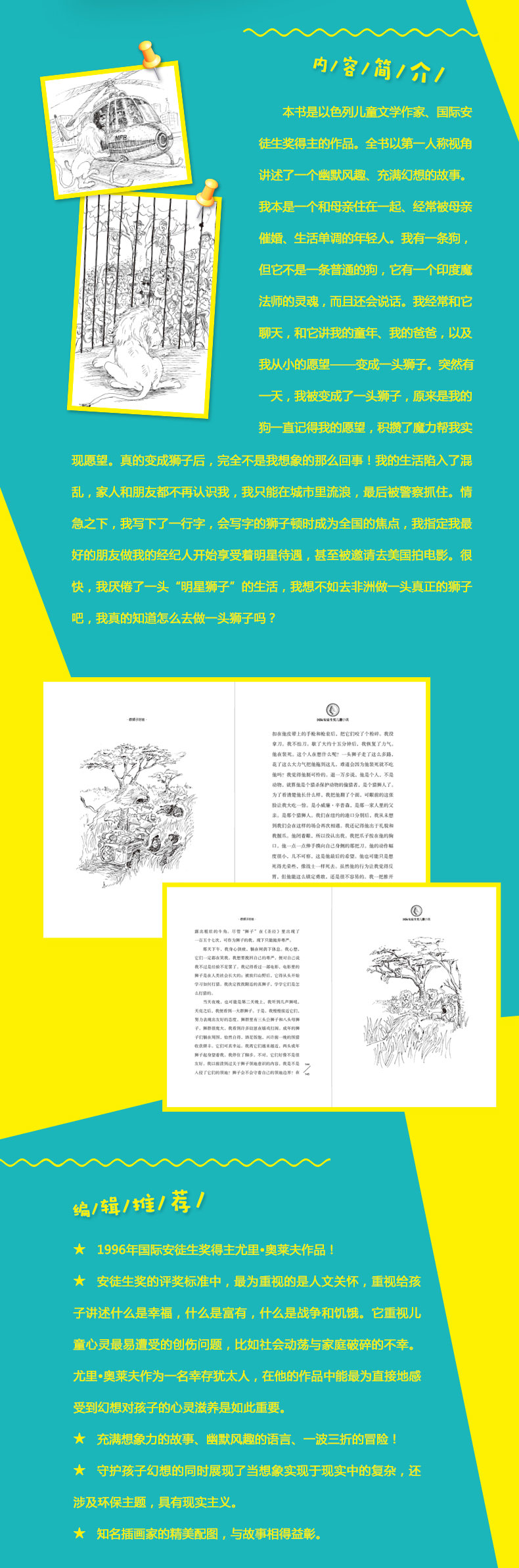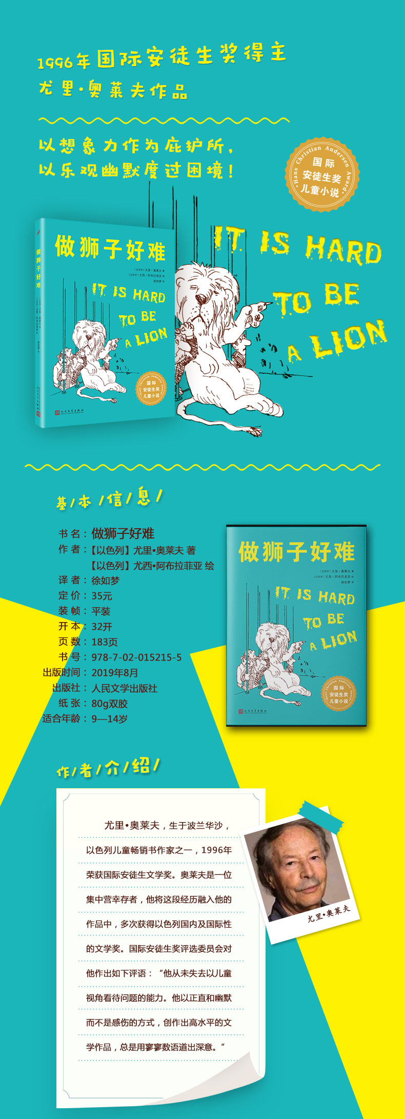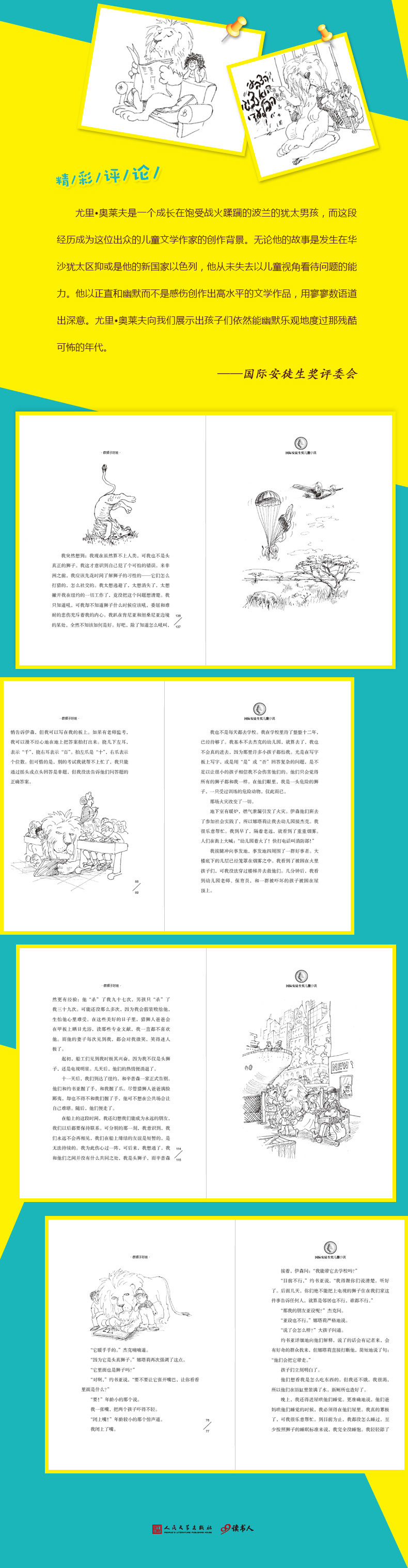 ★ 安徒生奖的评奖标准中,最为重视的是人文关怀,重视给孩子讲述什么是幸福,什么是富有,什么是战争和饥饿。它重视儿童心灵最易遭受的创伤问题,比如社会动荡与家庭破碎的不幸。尤里·奥莱夫作为一名幸存犹太人,在他的作品中能最为直接地感受到幻想对孩子的心灵滋养是如此重要。
