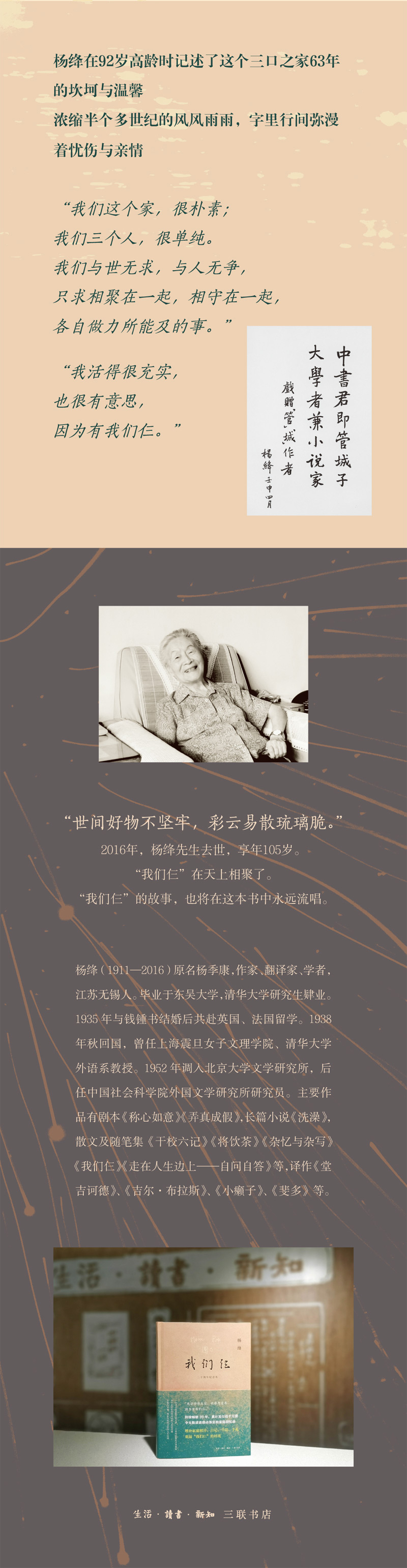 1998年,钱锺书先生的逝世使文化界深感悲痛。但罕为人知的是他和杨先生唯一的女儿钱瑗已于此前(1997年)先他们而去。一生的伴侣、唯一的女儿相继离去,杨绛先生晚年之情景非常人所能体味。在人生的伴侣离去四年后,92岁高龄的杨先生用心记述了他们这个特殊家庭63年的风风雨雨、点点滴滴,结成回忆录《我们仨》。