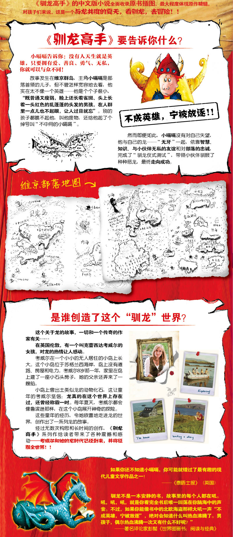 “驯龙高手”系列丛书来自英国,是一套童心洋溢的冒险成长小说,被欧美儿童文学界誉为“后哈利波特时代”最伟大的儿童文学作品。它以绝妙的幻想为基调,以维京部落男孩——小嗝嗝·霍兰德斯·黑线鳕三世的回忆录为线索,描写了小嗝嗝与自己的小龙——“无牙”一起,依靠智慧、勇气、无私的友谊,带领小伙伴,驯服种种恶龙,最终走向成功的故事。全书曲折丰富,情节多变,悬疑、浪漫、奇幻、传奇色彩等兼而有之;全书采用涂鸦式插图,图文结合,生动传神,活灵活现,营造出一种轻松幽默、兴趣盎然的情境。