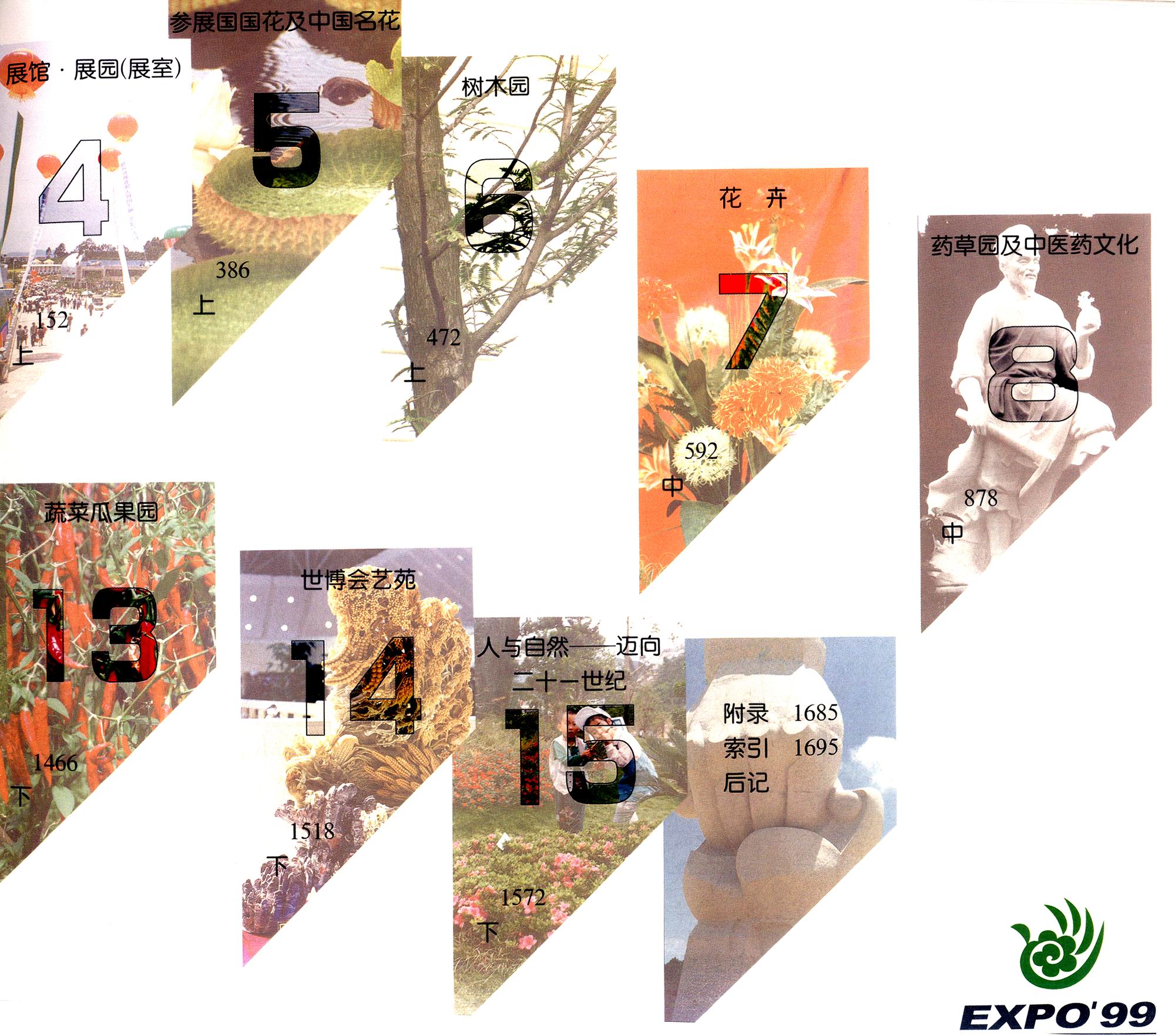 《中国’99昆明世界园艺博览会百科全书》: (5)中国馆的大厅和二楼回廊,展示了各地方政府和部分企业赠送的精湛展品。如贵州省的烙画,《黄果树大瀑布》,安徽省的铁画《迎客松》,辽宁省的岫岩河磨玉雕《凤戏牡丹》,湖南省的砂石粘贴画《武陵源》,黑龙江省的福桃大花瓶,青海省的《黄河石》等,凝聚了全国人民对世博会的深情厚意,组成了可圈可点的精品展厅。 3.温室馆 温室馆是重要的标志性和景观性建筑。大温室功能由门厅、展示厅、办公室、热带植物展厅、高山植物展厅、亚热带花卉展厅等几部分组成。建筑采用高透光保温玻璃、新型透光板材与钢结构相结合,整体结构轻巧空透。平面为同心圆结构,展厅自然形成扇形。立面由于功能需要,有不同的高度变化,热带植物展厅高度10~20m,亚热带花卉展厅高度10~16m,高山植物展厅高度8~12m。屋面为向内倾斜的坡屋面,形成一种螺旋上升的态势,隐喻人与自然和谐发展的辨证规律。温室选用现代化的设备,对室内的温度、湿度、通风等进行自动控制和调节。三个展厅面积共约1600m2,种植了1182个植物品种,是国内植物种类最多的展示温室。 (1)热带植物厅创建一个热带雨林植物群落景观,种植有约711种热带植物。其中有热带雨林特有的称作“大板根”的四数木,高宽约4m,是国内活体移植最大的“大板根”;还有绞杀榕、望天树、盈江龙脑香、婆罗双树、箭毒木等特色珍稀植物。厅内分为4个区:一是奇花异卉区,有玉蕊、无忧花、火烧花等热带花卉;二是附生荫生植物区,区内老树参天,附生植物缠绕,最具热带雨林特色;三是赏叶观果区,有树波罗、木奶果、云南红豆等奇果:四是水生植物区,种植有澳洲王莲、红睡莲等热带水生植物。 (2)高山植物厅种植有高山植物404种,馆内流水潺潺,具有高山流石滩的自然情趣。乔木有云杉、冷杉、落叶松等10余种。景观可分为三个区:一是植被景观区,以乔、灌木为主;二是高山草甸区,以高山草甸花卉为主,展现“五花草甸”景色;三是高山岩石植物区,以雪莲、绿绒蒿、红景天等植物为特色。 (3)亚热带花卉植物厅种植有542个植物品种,主要展示亚热带及温带的花卉植物资源,展现日日有花,月月有景的五彩缤纷的景观。共分为4个景区:一是多浆植物区:二是宿根花卉区,以花塔为构图中心;三是一、二年生草花区,组成各类花坛和花丛;四是观叶植物区。 4.人与自然馆 人与自然馆是以世博会主题命名的主场馆。建筑平面布局以三角形为基本单元,品合成三个六边型,建筑结构采用不锈钢空间网架,屋面采用具有装饰功能的复合铝板,形成立体的折板效果,像三朵开放的花蕾,与周围环境相得益彰。展厅布展内容共分为四个部分: (1)共同的家园展示地球的自然状态和自然资源,表现生物圈的进化与发展及人类生存的生境状态。借此让人了解自然,了解在自然环境中人的存在及自然与人的多样化的关系,表现人类依赖于自然,属于自然,是自然的一个组成部分。 (2)只有一个地球1972年在斯德哥尔摩召开的世界环境与发展大会提出的概念。人们开始意识到世界实际是有限的,并且开始对自然的破坏进行反省。这一部分展示由于人类无序开发、污染、过度开垦等导致的森林减少、沙漠化、水土流失、洪灾、水污染、大气污染、物种灭绝等恶果,发人深思,令人震憾。 (3)永远的绿洲乐观地展示人与自然相互依赖、协调发展的关系。可持续发展的思想,保护生物的多样性和文化多样性,现代生态农业及改善生态环境的努力,人与自然终将同生存、共荣辱。通过百万人环保签名大行动,全世界近10亿儿童参与的“生命之树”植树活动,使展出达到高潮。 (4)专题园艺展厅人与自然馆的第三展厅,用来组织专题园艺展出,举办了牡丹、君子兰、月季、插花艺术、赏石、观叶植物、球根花卉、兰花、菊花等九个大型专题展览。来自各个国家和全国各地的1万余件园艺展品得以展出,表现了园艺博览会的主题。 5.科技馆 科技馆是本次博览会的主展馆之一。建筑由二个主要功能厅组成,即环幕影厅和展厅。环幕影厅结构采用钢结构球型网架,面层为银灰色复合铝板,圆形影厅直径24m,可容观众230人。主展厅为钢筋混凝土框架结构,层高7.5m,顶部中间设置直径为12m的锥体玻璃采光顶。展厅布展主题为“科技与园艺”,共分为四个部分。 (1)大自然的馈赠——中国植物资源的多样性及分布展示森林生态系统等7个方面的生态系统,介绍中国的植物及植被分布,其中重点介绍了云南作为植物王国的资源及特色。 ……