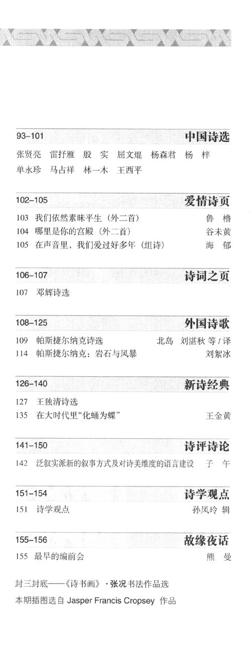 《中国诗歌 水边的月亮(2015年9月)》: 相逢 把宋时的微雨打散在你睫毛眨动的 清澈里。在四月,我让狭路开出了一朵 相逢。’水滴晶莹,去花瓣上婉转 那条幽深的小道, 让住在心中的风铃,一阵阵起伏。 舞过的步,是此时矜持的剪刀。却恨不得, 把时光剪出一对对鸳鸯,水上漂。 身边闪过往事。在过往的风中留不下 痕迹。留不下痕迹的 还有那声有着桃花一样颜色的 鸟鸣,躲过了一冬,就为了在撩人的 春光里,折腰。 一句青翠的江山如画,我的背就驼了。那条 问号一样的小河,在一次远离闹市的 相逢中,被雨,轻轻地写进 四月的眼神,被你,一遍遍覆盖, 仍然露出了白头,偕老。 人间茂密,谁会在人群里抽出一臂敦厚? 惟有你,把遮风挡雨 做成了四月的天,和骄傲。 桃色 就用这点残存的桃色,给你留一条 活路。我在一川烟雨的空白中 寻找前朝的花期,一不留神,就把沉寂 经年的封底,看成了栈道。 还要陈仓暗度么?四月尚早,七月 正好。我把水袖里的时光, 一段段地铺成前世,就有蝶翅 掀起一些暗哑,或是词牌, 或是歌谣。或者是一些青铜之气, 把那些被我落入俗套的人物, 磕碰出火苗。 桃花开了。在暖阳下用花蕊放出的 怒里,我竭力诉尽烦恼。 诉出你的惊讶,和你抖落浮尘之后的 光洁,以及可以清秋的美好。 不经意间,就有月色把来路填满,千里 之外,早有荷香轻绕。眼前这抹 已近尾声的桃色,推着你,桃之天天。 给我一杯明月 还是给我一杯明月吧,在时间的沧桑里 退隐过的明月,以再度开放的 宽容,照见遥远的我 和我的亲人们。还能用脉动着的 柔软,遏止那层硬壳的逸出。 不再麻木。 让鲜亮的依旧鲜亮,承载心与心之间 向善的柔情。 给我在杜甫草堂里的沉思。让闲下来的 目光,被秋风,带进广厦的 字里行间。与一位 清癯的书生相逢一笑,我的笑, 能开成秋风中的菊么? 能在惆怅里倾泻一些温暖的 触摸么? 就请给我一双不再设防的手。 拆除心的藩篱, 裸露一条河的源头。 在清澈见底里,体味一种原始的 闪亮。心门洞开,让煦风 自由地进出,去敦厚里叙述一种 简单,和携手相扶的洁净。 一种和山川河流的肌肤相亲。我在 野百合细密的香气里,不再孤独。 ……