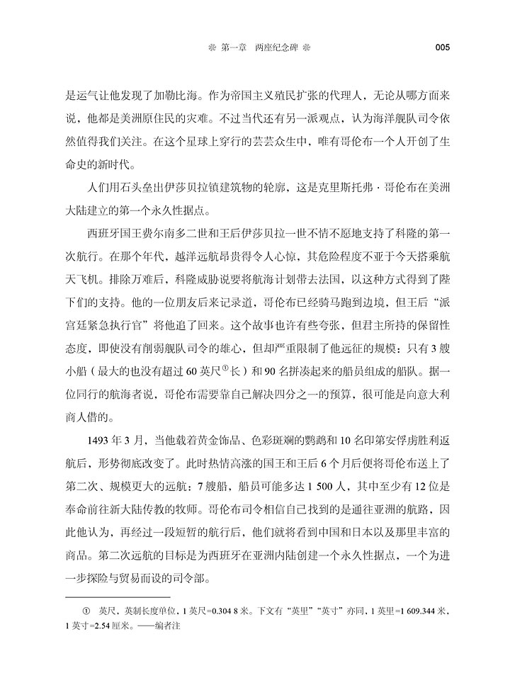 今天几乎没人知道伊莎贝拉镇。类似被遗忘的命运有时也会落在小镇创建者的头上。当然,历史教科书绝对没有遗漏科隆的名字,但在书中他已经不再像过去那样重要、那样令人钦佩。今天的评论家形容他是一个残酷且被蒙骗了的人,是运气让他发现了加勒比海。作为帝国主义殖民扩张的代理人,无论从哪方面来说,他都是美洲原住民的灾难。不过当代还有另一派观点,认为海洋舰队司令依然值得我们关注。在这个星球上穿行的芸芸众生中,唯有哥伦布一个人开创了生命史的新时代。