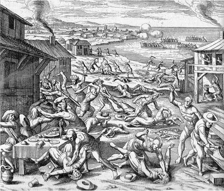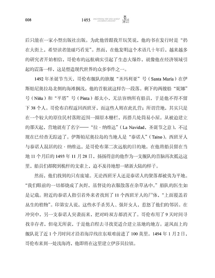 1492年圣诞节当天,哥伦布舰队的旗舰“圣玛利亚”号(Santa María)在伊斯帕尼奥拉岛北侧的海滩搁浅,他的首航就这样告一段落。剩下的两艘船“妮娜”号(Niña)和“平塔”号(Pinta)都太小,无法容纳所有船员,于是他不得不留下38个人。哥伦布启程返回西班牙,而这些人则在此扎营;所谓营地,其实只是在一个较大的原住民村落附近围一圈原木栅栏,再搭几处简易小屋。从被迫建立的那天起,营地就有了名字—“拉•纳维达”(La Navidad,圣诞节之意),不过现在已经杳无踪迹了。伊斯帕尼奥拉岛的当地人是“泰诺人”(Taino)。西班牙人与泰诺人混居的拉•纳维达,是哥伦布第二次远航的目的地。在他将船员留在当地11个月后的1493年11月28日,扬扬得意的他作为一支舰队的首脑再次抵达这里,船员们都爬到桅杆的支索上,迫不及待地想一睹新大陆的样子。