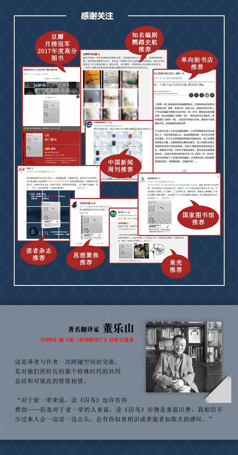 对于八十年代的新一辈来说,读《囚鸟》也许觉得有些费劲,对于其中一些历史事实也许觉得有些生疏。但是对于老一辈的人来说,读《囚鸟》仿佛是重温旧梦,我相信不少过来人会一边读一边点头,会有似曾相识或者逝者如斯夫的感叹。