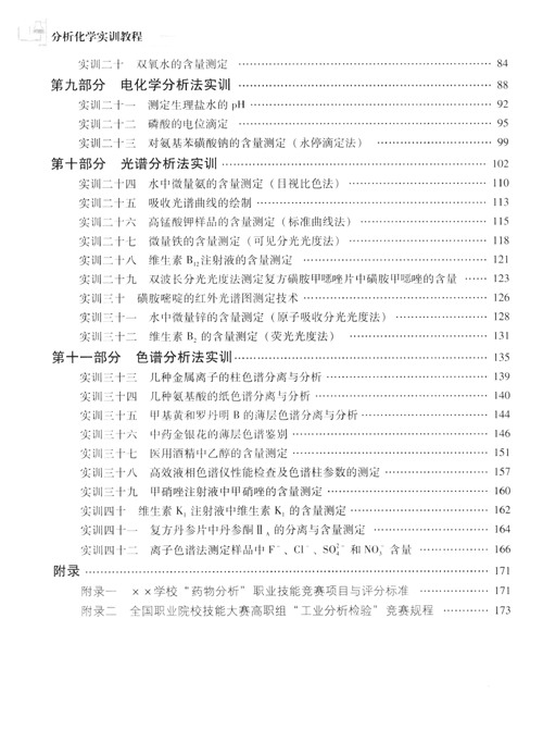 《分析化学实训教程/全国高职高专药学类食品药品类专业“十三五”规划教材》是根据高职高专分析化学课程的教学大纲基本要求和课程特点编写而成,设计了较为全面的实训项目,内容涵盖了化学分析和仪器分析基本操作、设备校正、检定及维护、技能大赛赛点知识等内容,力求强化基础、贴合行业基本要求,教材编写还融合了理实一体化、探究式等成熟的教学理念,能满足各类专业的分析化学课程的实训教学需求。本实训教程共分为11部分,42个实训内容。 《分析化学实训教程/全国高职高专药学类食品药品类专业“十三五”规划教材》编写内容在安排上由简到难,循序渐进,突出重点,将释疑穿插于正文中,助力难点破解;通过实训思考板块,梳理重点难点;增加了实训体会板块,通过依据实验结果进行的自我总结,自查实训错误产生的根源,促进理论知识的掌握和技能技巧的提升;通过技能考点及赛点的学习,利于学生感受行业要求,进行自我对比,并提高相关技能素质。教材尽量结合药学类及食品药品类专业学生工作的实际行业特点,体现分析化学操作和计算的注意事项,内容丰富、新颖。 《分析化学实训教程/全国高职高专药学类食品药品类专业“十三五”规划教材》供高职高专药学类、药品制造类、药品经营与管理类、药品质量与安全类、食品药品管理类、药品生产技术类、中药学、食品检测技术类各专业通用,也可供其他相关专业、师生、分析测试技术人员和自学者参考。