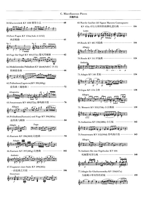 《莫扎特钢琴作品集(原作版)》包含了除奏鸣曲和变奏曲以外的所有莫扎特的钢琴作品。主要有17首献给姐姐玛丽亚·安娜·莫扎特的作品;40首伦敦乐谱;20首多主题多体裁的钢琴作品;9首根据管弦乐队演奏的舞曲、进行曲改编的钢琴作品;附录部分是8首莫扎特无法归类的作品,另有3首来自萨尔茨堡乐谱,被后人考证为是莫扎特所做的钢琴作品。