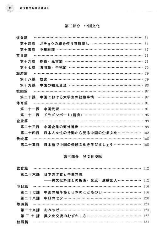 《跨文化交际日语晨读2》为跨文化交际日语晨读系列教材之一,使用对象为大学日语专业二年级学生。 《跨文化交际日语晨读2》分成三大模块,分别为日本文化、中国文化和异文化交际。每个模块又进一步下分为饮食篇、节日篇、旅游篇、校园篇、体育篇、企业篇和传统篇七个相关主题。每个主题均设置了背景导读、文章精选和知识窗三部分,以期扩大学生的知识面,增长跨文化领域的见解。
