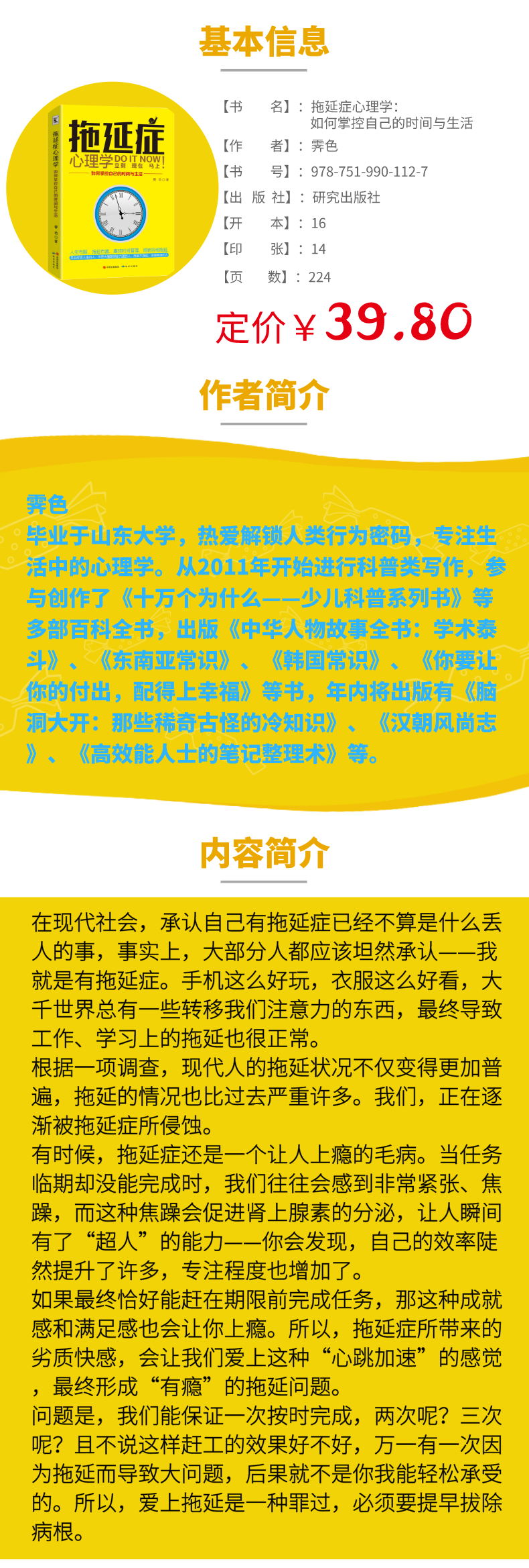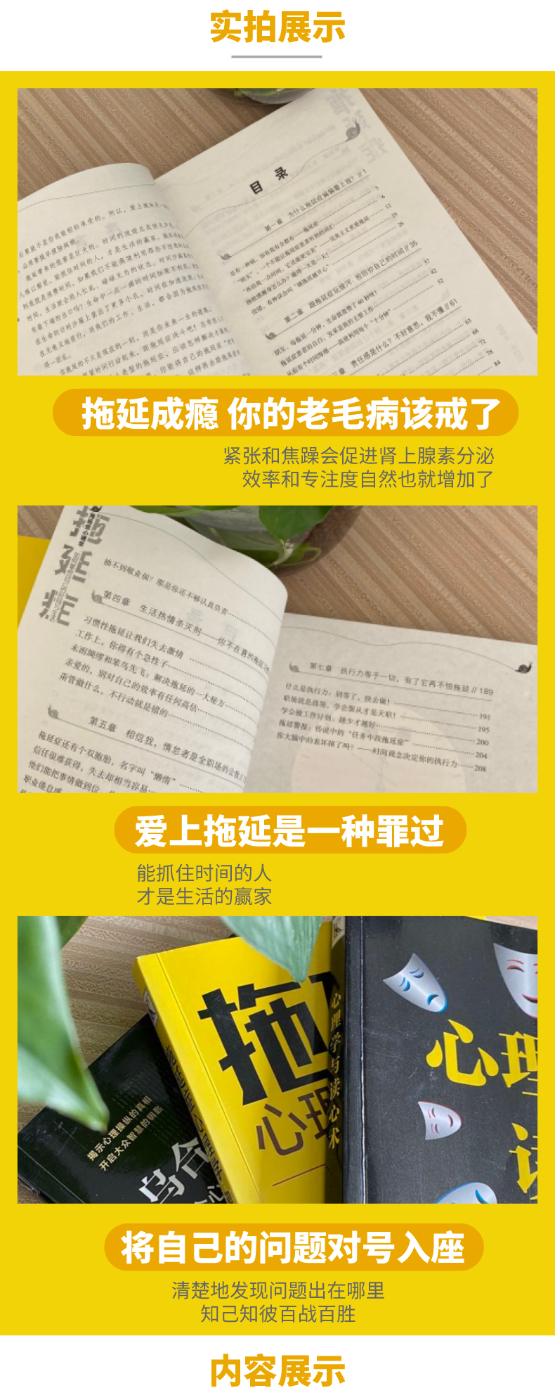 第1章 拖延现象,谁为你的拖延埋单001今天你拖延了吗?002幼时的不良习惯会导致拖延症005拖延症有哪些具体表现?008现时偏向型偏好的根源012你知道拖延症的严重后果吗?016测试:你的拖延症是否严重?019第2章 拖延症结,你为什么喜欢磨蹭021低自我效能感和自尊022自我设阻,害怕会失败024心理拖延,总是迟迟不作决定027积极拖延,适时的压力更有效030拖延和自律,意识和潜意识034第3章 隔离环境,远离一切干扰的因素037别让分外事干扰自己038延迟痛苦,做感兴趣的事042你每天有多少时间被打扰了?045别打退堂鼓,没有尝试永远完不成048娱乐八卦只会分散你的注意力051适当关闭手机,切断干扰源054第4章 自控规则,别让惰性打败你 059你是如何养成懒惰习惯的060懒惰不是安逸,而是借口的源头063懒惰的人总说“没时间”065犹太人的“第克替特时间”068学习曾国藩的五勤070戒掉懒惰,努力才能成功073第5章 超限效应,其实你不需要完美077你的缺点就是太过完美主义078总拒绝没有把握的事情082瑕疵,是完美的前提 084事情总会出现意外的转机086失败也不是大不了的事情089其实根本没人在意你 092第6章 目标计划,找准人生的指南针097方法比瞎忙更重要098拟定目标,制订行动计划101番茄钟,作好工作和休息计划105没有梦想,行动就没有焦点108不妨先从周计划开始111最后通牒效应,设定最后期限115第7章 20秒规则,直截了当地行动吧 119想太多,不如做了再说120完成目标,马上行动123先解决你认为最重要的事情125做事始于心动,成于行动128将怨气付诸实际行动130第8章 正念训练,率先做好当下之事135用正确的方式做事是一种能力136不做则已,做则一定要做好138做事不能只有“三分钟热情”141第一次把事情做到位144每天坚持做好一件事情148第9章 时间管理,持续高效地做事 151到底先做哪件事?152时间管理中的平衡法则155碎片化时间管理159如何最大限度提高做事效率161对的时间做对的事情165会休息的人才能更好地做事168第10章 拒绝借口,别陷入拖延的泥沼171人生是没有任何借口的172只能找方法,而不是寻找借口175有想过比抱怨更好的解决方法吗?178做好本职工作,无需借口181失败的人找借口,成功的人找理由184生活不需要眼泪,需要汗水187第11章 承担责任,增强自我效能感 189真的是工作难以完成吗? 190不逃避困难,勇于承担责任 191不留后路,才容易找到出路 194服从领导,绝不推卸责任 197既然接受任务,就要担负到底200学会对自己的一切行为负责203第12章 阻断心理,养成速战速决的习惯207时刻提醒,写好每日备忘录208积极暗示,改变认识210适当放松,转移注意力213重振斗志,别做温水里的青蛙215参考文献219