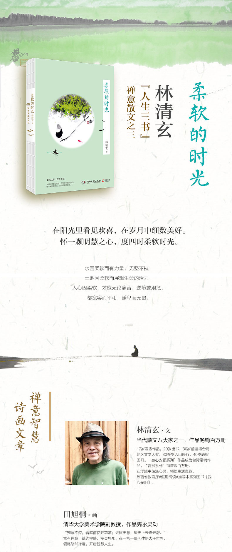 《柔软的时光》是台湾作家林清玄继《我心光明》《让人生无忧》之后,禅意散文系列“人生三书”之三 。因为柔软,我们才能敏感,因为敏感,我们才能觉察到不一样的风吹草动。