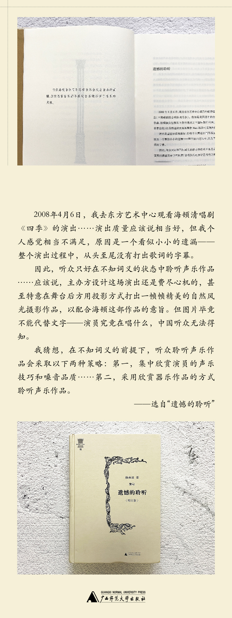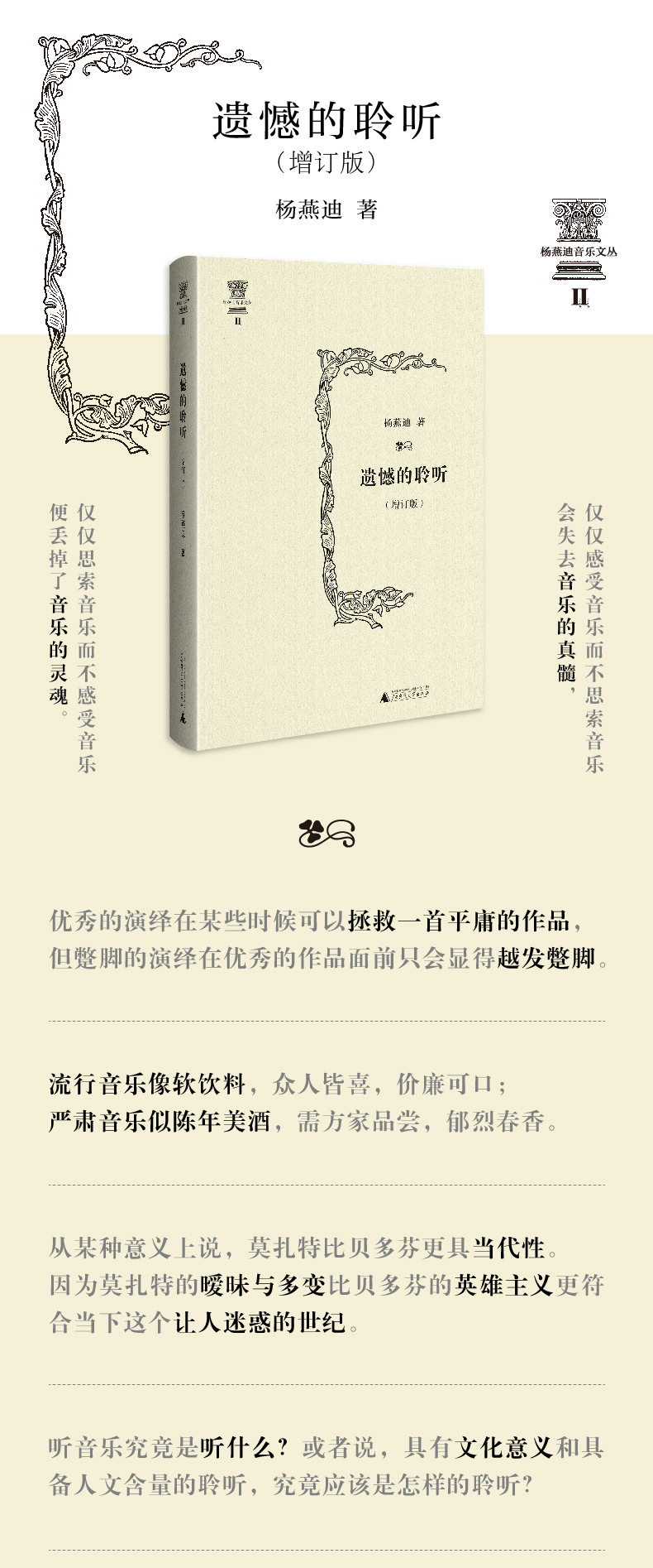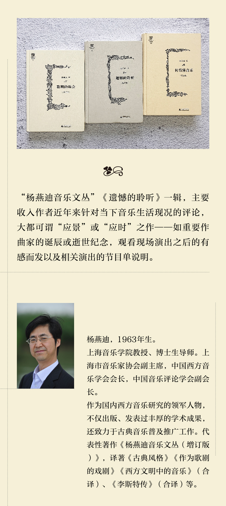 《杨燕迪音乐文丛》(增订版)是杨燕迪教授多年来在各个报刊杂志中发表的音乐评论文章集锦,包括《歌剧的误会》《遗憾的聆听》及《何谓懂音乐》三本。其中,《遗憾的聆听》一辑主要收入杨燕迪教授近年来针对当下音乐生活现况的评论,大都可谓「应景」或「应时」之作——如重要作曲家的诞辰或逝世纪念,观看现场演出之后的有感而发以及相关演出的节目单说明。