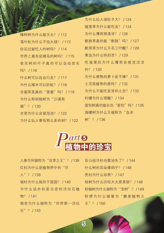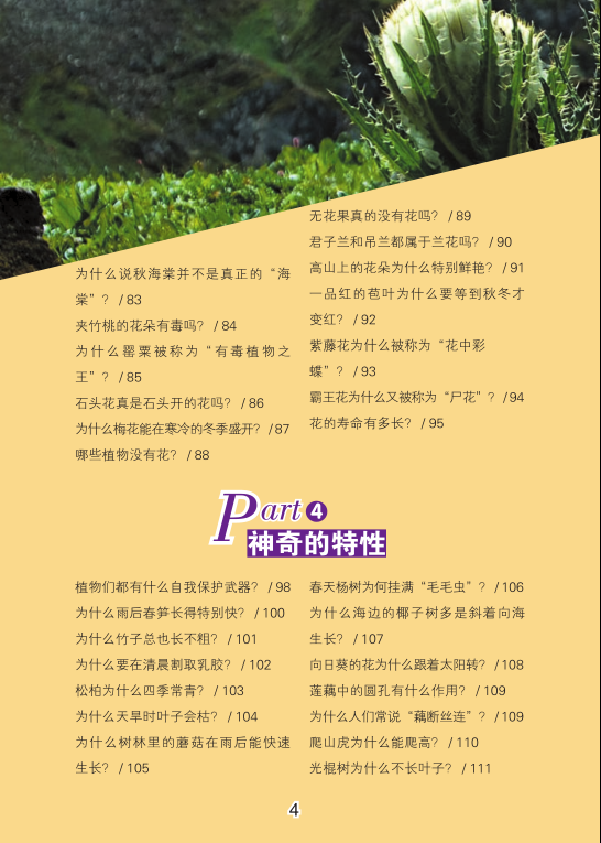 在自然界中,生物的足迹遍布各处,无时无刻不在展现着生命的活力。植物是地球生命的重要组成部分,数个世纪以来,人类不断惊异于它们生存、繁育所演绎出的一个又一个奇迹。比起动物,植物是地球上更为古老的居民,它们经历了数亿年的漫长岁月,才完成了从简单到复杂,从低级到高级,从水生到陆生的进化,形成我们现在所看到的植物界。据估算,现存植物物种大约有350000个,它们有的会“害羞”,有的会“说话”,有的很“顽皮”,有的则很爱“睡”……它们的奇趣异彩装点了大自然,也为人类的精神生活提供了基础需要。许多人可能都没有注意到,我们每一次踏过的草丛,每一次嗅过的花朵,每一次倚靠的大树,它们的成长都是有故事的,正如地球上的每一个生命。