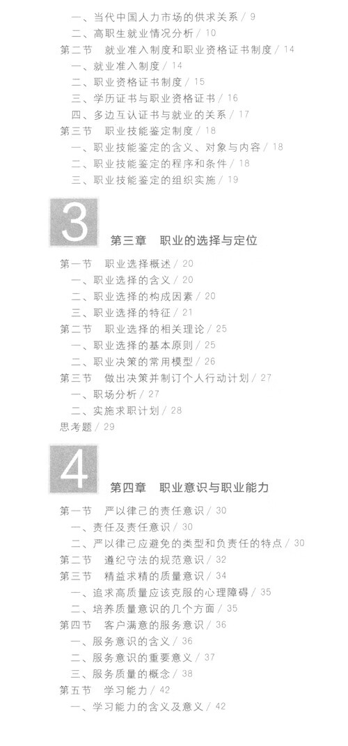 《就业指导》从目前高职学生的就业环境和就业形势入手分析,按照大学生择业所需要具备的知识能力要求共分十二章进行讲解。包括职业选择、大学生求职择业心理、就业市场与就业政策、求职自荐材料的准备、面试技巧、权益与法律保障、自主创业、职场适应与职业发展等内容。通过对职业的选择和定位、职业意识与能力知识的学习,使学生进一步树立服务社会的观念,加强职业道德修养;通过对制作自荐材料、求职信息、着装礼仪、面试技巧的学习运用,进一步增强学生的就业竞争力,对帮助学生获取就业信息、制作求职材料、进行职业生涯规划、认识自我、自主创业、劳动权益保障等都会有相当的帮助,书中穿插了一定的案例,对学生提升综合素质、培养创业素养、提高就业能力有一定的指导作用。