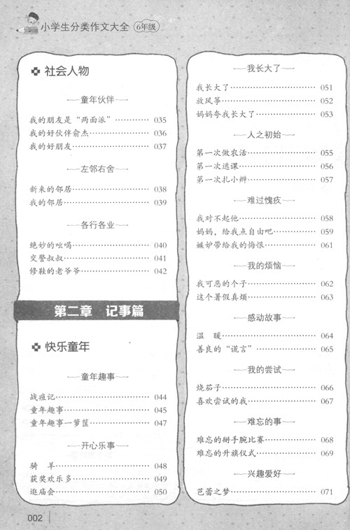 《小学生分类作文大全(6年级)/作文高分王》分类精细,全书细分为100多个小类,囊括4年级常写、常考的所有作文母题;精心挑选300多篇精彩的范文,多角度地给学生提供学习、模仿的范本,方便学生快速查找作文;每篇文章精心列举一至两招好技法,作为学生学习范文的重点,点评精辟,举例实用,帮助学生快速学习作文各类技法;文章后还附有“练一练”栏目,精心出题,让学生从实践中提高作文水平;理论从“入门”和“高分” 两方面入手,解析作文写作方法,系统地帮助学生掌握写作技巧,简洁易懂。